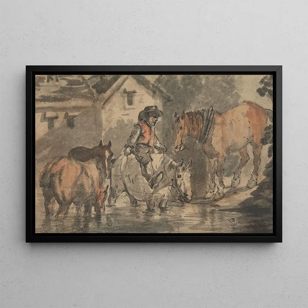 The art print of "Man watering four horses" makes a captivating decorative addition to various spaces, whether in an office, reading room, or living room. Its print quality and attention to detail make it a choice piece for those who appreciate animal art and rural life. This painting, with its rustic charm, brings a touch of authenticity and warmth to your interior. By choosing this canvas, you offer your space a piece that tells a story, while adding an artistic dimension to your decor.