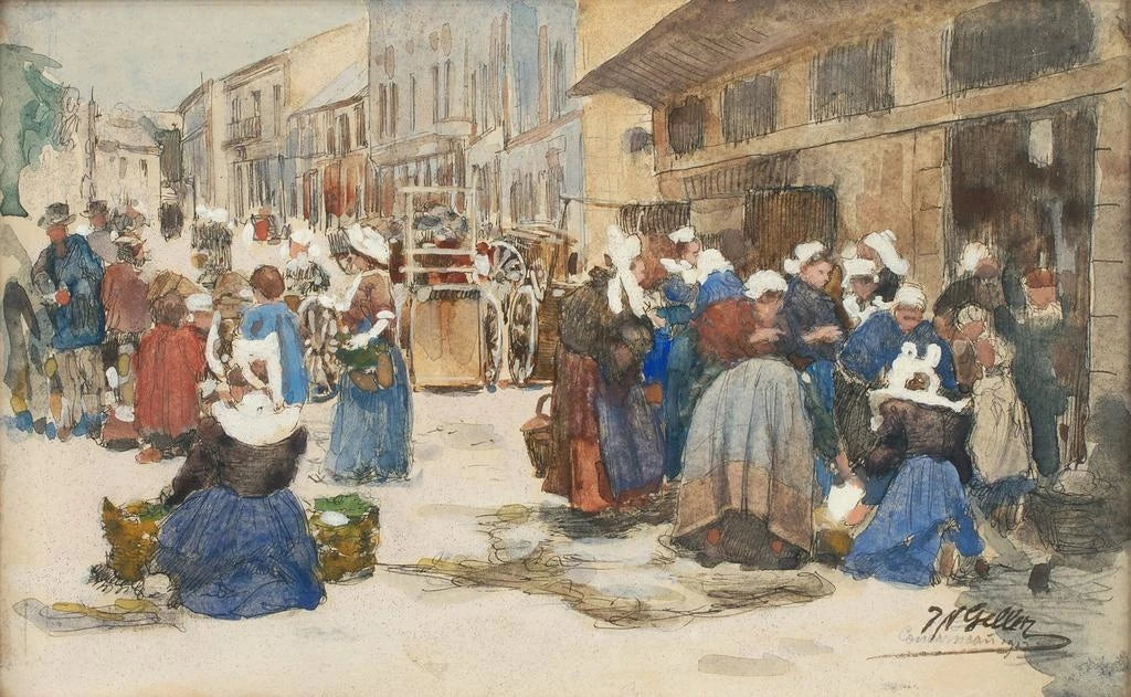 "Market in Concarneau" by Johann Nepomuk Geiger is a piece that captures the lively essence of Breton life. The canvas depicts an animated market scene, where the bright colors of vendors' clothing and local products blend with the soft morning light. Geiger employs an impressionist technique, with quick brushstrokes and touches of color that bring this picturesque scene to life. The atmosphere is filled with conviviality, inviting the viewer to immerse themselves in this warm and authentic ambiance.
