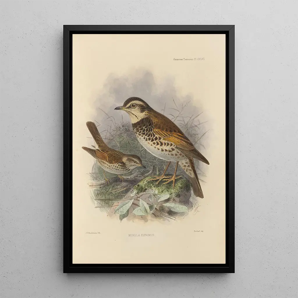 Merula Eunomus: a symphony of colors and shapes The art print of Merula Eunomus immerses us in a vibrant universe where nature reveals itself with brilliance. The shimmering hues and meticulous details of this bird, captured by the artist, evoke a perfect harmony between the subject and its environment. The watercolor technique, used with mastery, gives the piece a lightness and fluidity that seem to bring the bird to life. The atmosphere emanating from this canvas is both serene and captivating, inviting the viewer to explore every nuance and contour. Henry Seebohm: a pioneer of artistic ornithology Henry Seebohm, naturalist and ornithologist of the 19th century, skillfully combined his passion for birds with his artistic talent. His works, including the art print of Merula Eunomus, testify to an era when the observation of nature was both scientific and aesthetic. Influenced by the discoveries of his time, Seebohm contributed to the documentation of avian species while representing them with remarkable precision. His work is essential for understanding the biodiversity of his era and the importance of species conservation, making him an indispensable figure in the world of naturalist art. A decorative acquisition with multiple advantages Choosing the art print of Merula Eunomus means selecting a decorative piece that will enhance your interior. Whether in a living room, office, or bedroom, this artwork adds a touch of nature and serenity to your space. The quality of the reproduction guarantees fidelity to the colors and details of the original, while offering undeniable aesthetic appeal. By adding this piece to your collection, you not only invite the beauty of wildlife into your daily life but also a piece of artistic history that will enrich your interior decoration.