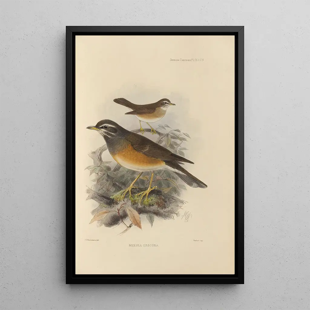 The art print of Merula Obscura immerses us in a mysterious universe where dark shades blend with flashes of light. Henry Seebohm, with remarkable mastery of technique, uses deep colors and striking contrasts to capture the essence of this bird. The dynamic composition draws the eye, while the blurred background evokes an atmosphere of tranquility, almost dreamlike. Every detail, from the delicate plumage to the subtle reflections, testifies to a meticulous observation of nature, inviting the viewer to immerse themselves in this captivating artwork.