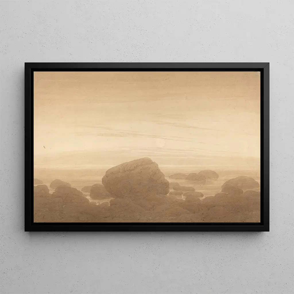 Caspar David Friedrich, a German painter of the early 19th century, is a central figure of the Romantic movement. His work is characterized by an exploration of themes of nature, solitude, and infinity. Influenced by the landscapes of his childhood in Pomerania, Friedrich captured the sublime beauty of nature while infusing it with a spiritual dimension. His works, often populated with contemplative figures, reflect a quest for meaning and emotion, making him a pioneer of Romanticism in Europe. Moonrise over a lonely shore is a perfect example of his unique style and his ability to evoke profound feelings.