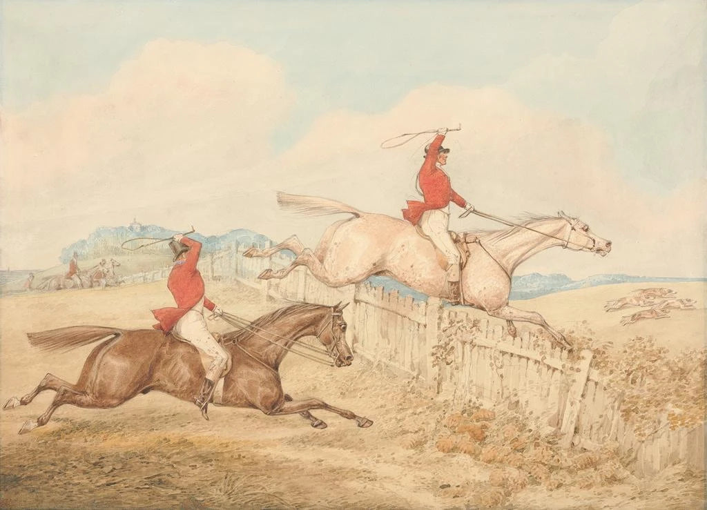 "Jumping a Wooden Fence" is an iconic work by Henry Thomas Alken that illustrates the passion for horse racing and outdoor activities in the 19th century. This painting depicts a rider in full action, clearing a fence with palpable grace and energy. The warm, earthy colors, combined with meticulous details, create a lively and dynamic atmosphere. The artwork evokes not only movement but also the spirit of adventure and freedom that characterizes equestrian sports of the era.
