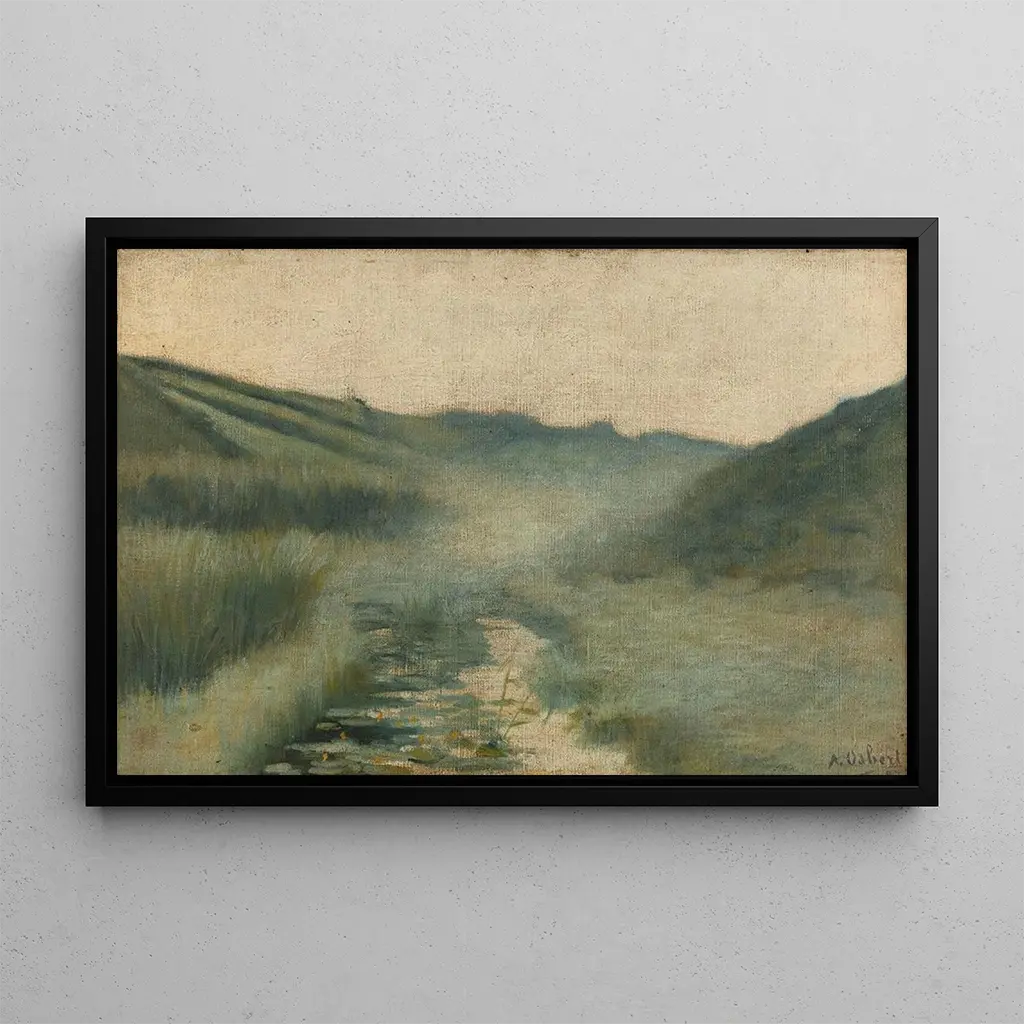 In "Morning Fog at Dilette Flamanville," Alphonse Osbert immerses us in a misty and poetic atmosphere. The shades of gray and blue blend harmoniously, creating a sense of evanescence. The artist's technique, which employs delicate touches and subtle gradients, enhances the softness of the scene. This art print evokes an almost unreal tranquility, where nature seems suspended in time. The silhouettes of the trees are barely outlined, as if emerging from a dream. The piece invites contemplation, an immersion into a landscape where reality and imagination blend.