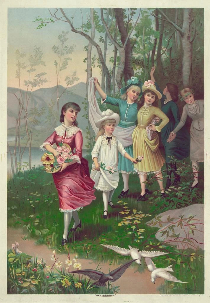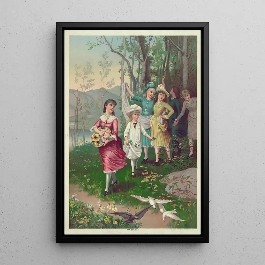 Le tableau Matin de mai évoque une atmosphère de sérénité et de renouveau. Les couleurs pastel, mêlant des nuances de vert tendre et de bleu ciel, créent une harmonie visuelle qui invite à la contemplation. La technique lithographique utilisée par Hatch Lith Co donne une texture délicate à l'œuvre, accentuant la légèreté des éléments naturels représentés. Les rayons du soleil filtrent à travers les feuillages, apportant une luminosité douce qui enveloppe le spectateur dans une ambiance paisible. Chaque détail, des fleurs épanouies aux oiseaux chantants, contribue à cette sensation de joie et de renouveau, typique du printemps.