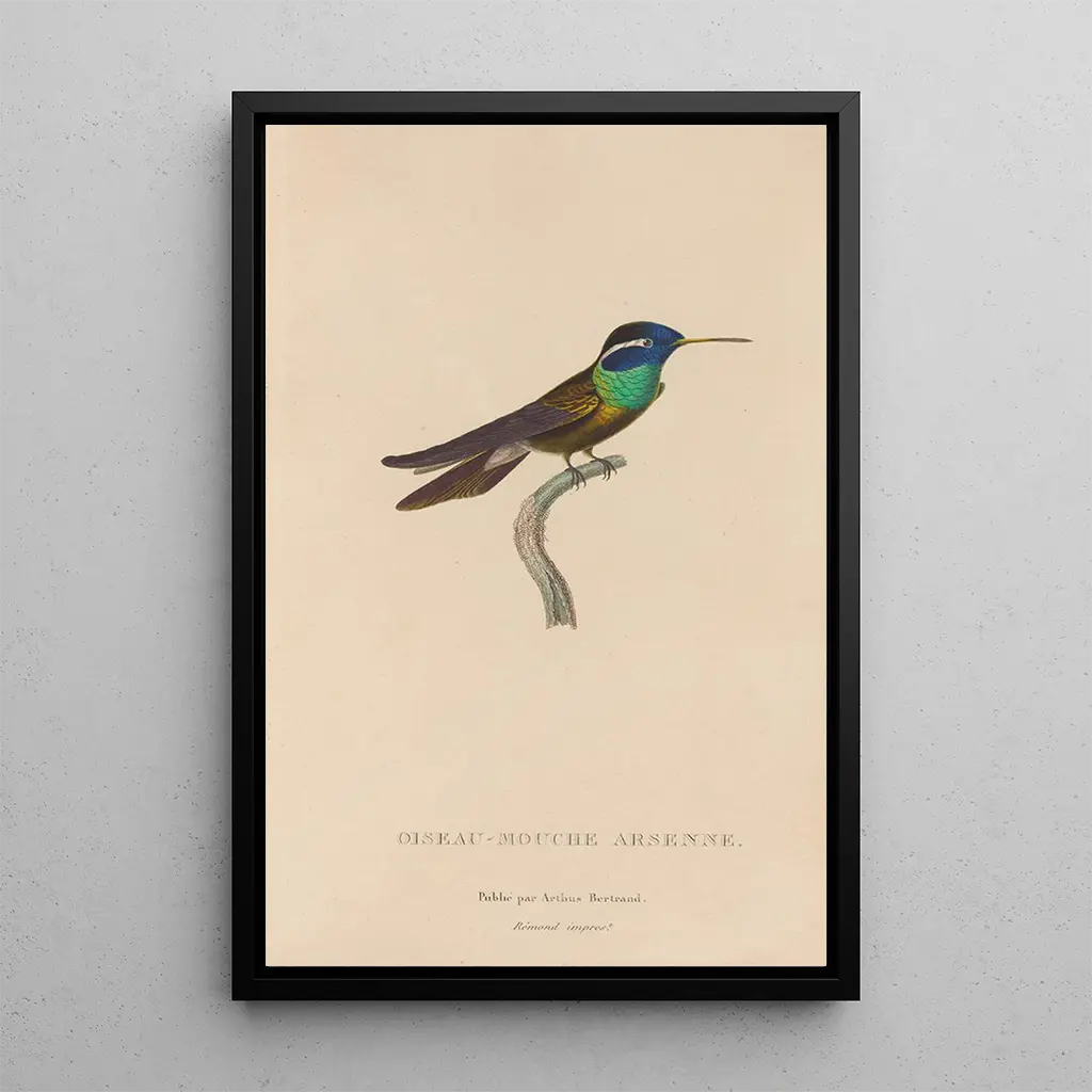 Histoire naturelle des oiseaux-mouches Pl09 : a ballet of colors and shapes The art print Histoire naturelle des oiseaux-mouches Pl09 is a true ode to avian diversity. The vivid hues and delicate patterns of the plumage intertwine to create a lively tableau, where each bird seems to take flight. René Primevère Lesson's mastery of watercolor captures the lightness and grace of these creatures, while offering captivating visual depth. The atmosphere of the piece is both joyful and soothing, inviting the viewer to immerse themselves in a universe where nature expresses itself in all its splendor. René Primevère Lesson: an artist at the crossroads of art and science René Primevère Lesson, active in the 19th century, is renowned for his innovative approach to ornithological illustration. His scientific background, combined with his artistic talent, allowed him to produce works that transcend the simple realm of illustration. Influenced by the naturalist explorations of his time, he was able to capture the beauty of hummingbirds with remarkable precision. His works, including Histoire naturelle des oiseaux-mouches Pl09, have become references for both art enthusiasts and scientists, demonstrating the interaction between art and nature. A decorative acquisition with multiple advantages The art print Histoire naturelle des oiseaux-mouches Pl09 is a wise decorative choice to enhance your interior. Whether in a living room, office, or bedroom, this canvas adds a touch of color and life. The print quality guarantees exceptional fidelity to the details of the original work, while offering a refined aesthetic. By incorporating this art print into your decor, you create an inspiring and warm space, paying tribute to the beauty of nature and the art of René Primevère Lesson.