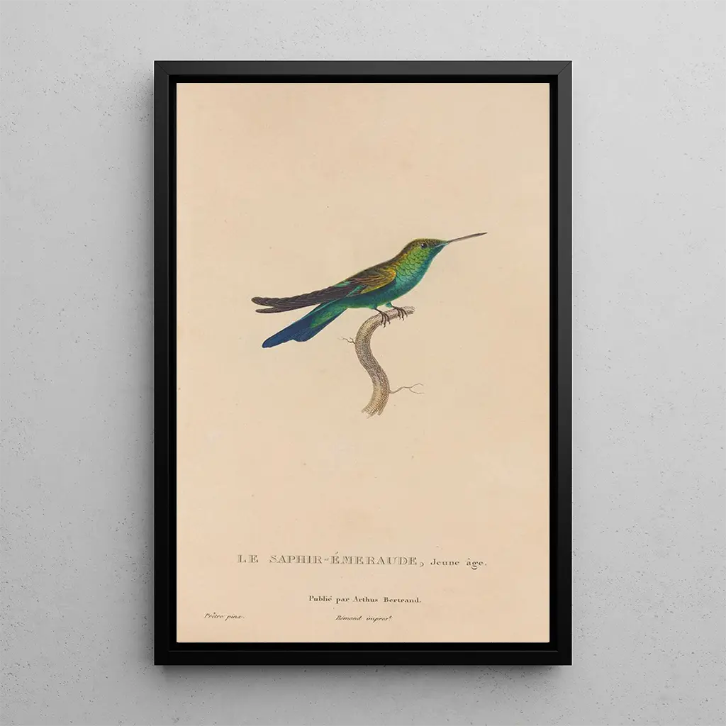 Histoire naturelle des oiseaux-mouches Pl51 : un voyage au cœur de la biodiversité L'œuvre "Histoire naturelle des oiseaux-mouches Pl51" de René Primevère Lesson nous transporte dans un univers vibrant où la nature s'exprime avec éclat. Cette planche, riche en couleurs, présente une variété d'oiseaux-mouches, chacun illustré avec une précision remarquable. Les teintes éclatantes de rose, d'orange et de vert s'entrelacent, créant une atmosphère dynamique et vivante. La technique de l'aquarelle, maîtrisée par Lesson, permet de rendre la légèreté et la grâce de ces oiseaux, presque palpables. Chaque détail, des plumes aux poses, est soigneusement pensé, invitant le spectateur à une contemplation émerveillée. René Primevère Lesson : l'art au service de la science René Primevère Lesson, naturaliste et artiste du XIXe siècle, est reconnu pour son approche novatrice de l'illustration ornithologique. Influencé par les avancées scientifiques de son époque, il a su marier art et savoir, offrant des représentations précises et esthétiques des espèces aviaires. Son travail, notamment à travers des œuvres comme "Histoire naturelle des oiseaux-mouches", a joué un rôle clé dans la documentation de la biodiversité. Lesson a ainsi laissé un héritage durable, alliant passion pour la nature et talent artistique, faisant de lui une figure emblématique de l'illustration naturaliste. Une acquisition décorative aux multiples atouts La reproduction de "Histoire naturelle des oiseaux-mouches Pl51" constitue un ajout précieux à votre décoration intérieure, que ce soit dans un salon, un bureau ou une chambre. Sa qualité d'impression assure une fidélité exceptionnelle aux couleurs et aux détails de l'œuvre originale, apportant une touche de fraîcheur et de nature à votre espace. Ce tableau, avec son attrait esthétique, saura captiver les regards et susciter des conversations. En intégrant cette toile dans votre intérieur, vous créez une atmosphère inspirante et élégante, tout en rendant hommage à l'art d'un maître de l'illustration ornithologique.