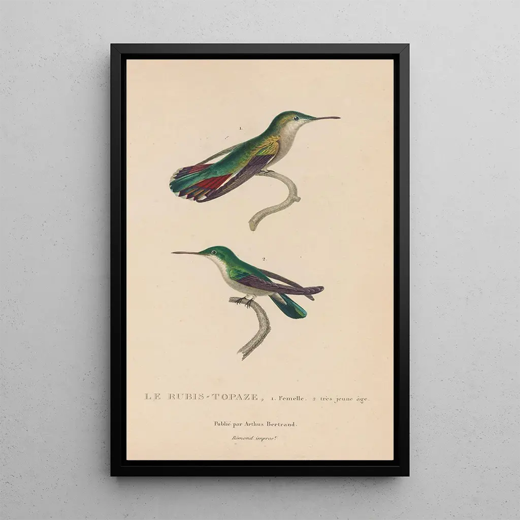 Histoire naturelle des oiseaux-mouches Pl54 : a celebration of lightness The art print Histoire naturelle des oiseaux-mouches Pl54 invites you on an enchanting journey into the heart of nature. This canvas, rich in detail, highlights delicate hummingbirds, suspended in an aerial ballet. The vibrant colors, ranging from dazzling greens to soft pinks, create a lively and joyful atmosphere. The artist's technique, blending precision and fluidity, allows you to feel the lightness of these ethereal creatures. Each feather is rendered with care, and the overall composition evokes a perfect harmony between the birds and their floral environment. René Primevère Lesson: a pioneer of artistic ornithology René Primevère Lesson, 19th-century naturalist and illustrator, captured the beauty of birds with unmatched accuracy. Influenced by the scientific discoveries of his time, he dedicated his life to the study of birds, particularly exotic species. His work, often associated with the naturalist movement, played a crucial role in documenting avian biodiversity. Lesson traveled around the world, collecting specimens and inspiration for his illustrations. His legacy endures through works like Histoire naturelle des oiseaux-mouches Pl54, which testify to his dedication to science and art. A decorative acquisition with multiple assets The art print Histoire naturelle des oiseaux-mouches Pl54 makes an elegant addition to any interior decor. Whether in a living room, office, or bedroom, this canvas draws the eye and inspires admiration. Its printing quality guarantees remarkable fidelity to the original details, allowing you to fully enjoy the beauty of the artwork. With its aesthetic appeal and colorful palette, this reproduction enriches the space while adding a touch of nature and lightness. It is a piece that is sure to appeal to art and nature enthusiasts alike.