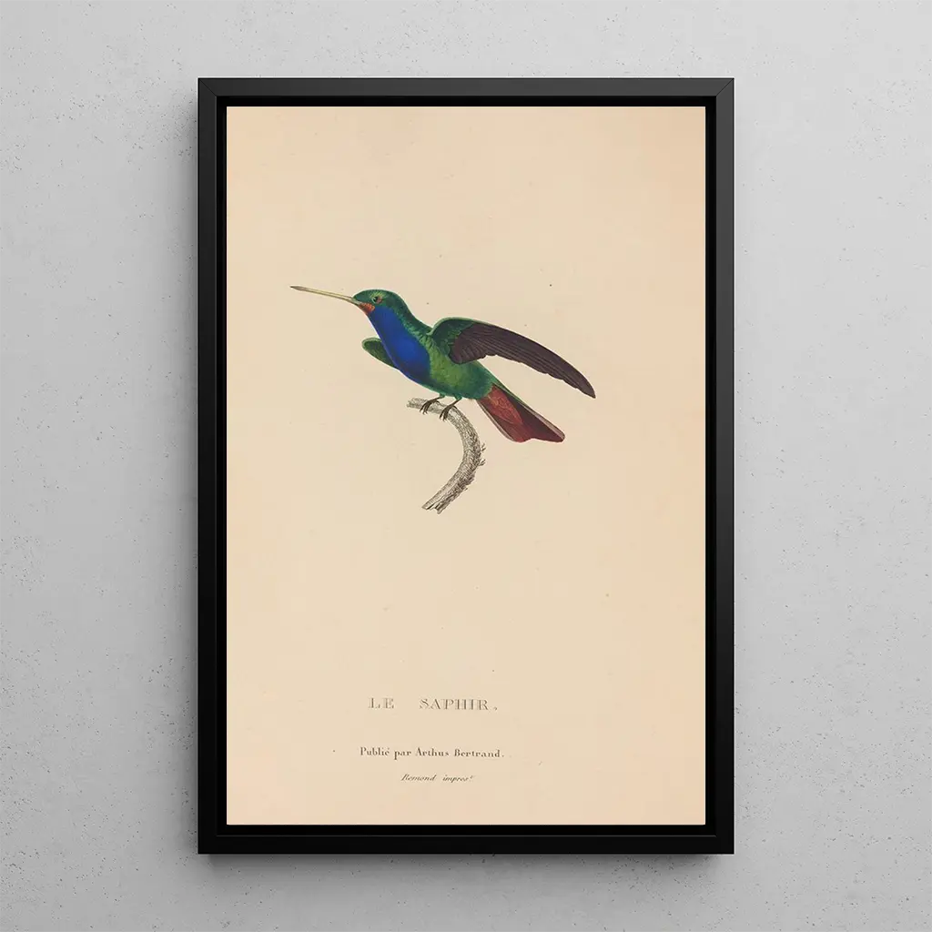 The art print Histoire naturelle des oiseaux-mouches Pl56 offers a fascinating glimpse into the diversity and elegance of hummingbirds. With vibrant colors and meticulous details, this piece captures the eye and invites wonder. The bright hues of the plumage, ranging from emerald greens to fiery reds, are rendered with remarkable precision. The engraving technique used by René Primevère Lesson allows for the capture of the lightness and movement of these delicate creatures, creating a lively and dynamic atmosphere. Each bird seems almost ready to take flight, adding a poetic dimension to this naturalistic representation. René Primevère Lesson: a pioneer of artistic ornithology René Primevère Lesson, naturalist and illustrator of the 19th century, played a key role in the study of birds and their artistic representation. Influenced by the discoveries of his time, he mastered the blend of science and art, creating works that are both informative and aesthetic. His period of creation coincides with a growing interest in biodiversity, notably during colonial explorations. Lesson contributed to the documentation of numerous species, making his illustrations valuable references for ornithologists and art enthusiasts. His work demonstrates the importance of nature in art and the interconnectedness of science and aesthetics. A decorative acquisition with multiple assets The art print Histoire naturelle des oiseaux-mouches Pl56 is an ideal decorative piece for various spaces, whether in a living room, office, or bedroom. Its print quality guarantees fidelity to the original details, allowing full appreciation of the beauty of hummingbirds. This artwork brings a touch of nature and color to your interior, while sparking conversations about art and science. With its undeniable aesthetic appeal, this canvas integrates harmoniously into any decor, adding a note of elegance and curiosity to your environment.