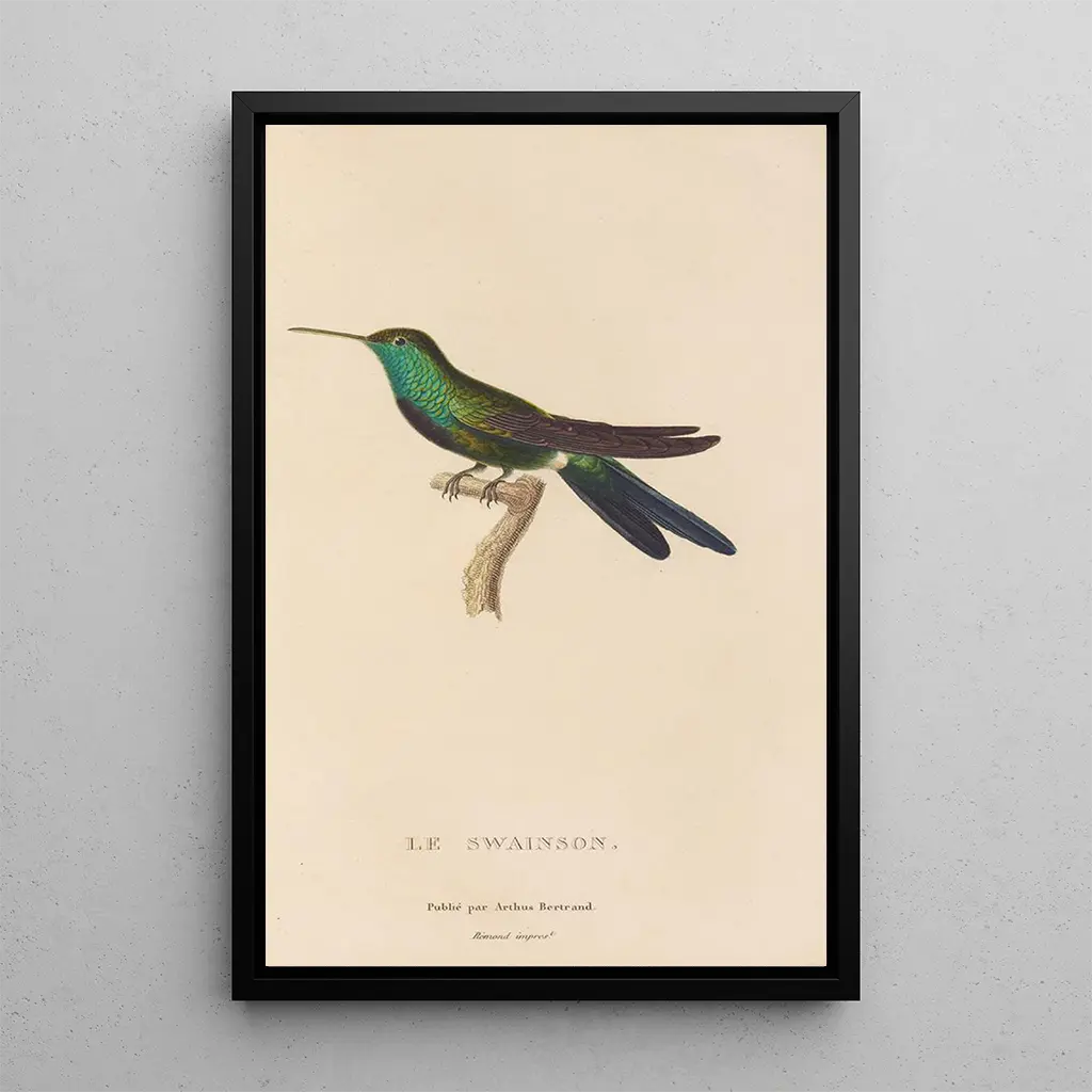 The art print Histoire naturelle des oiseaux-mouches Pl71 offers a fascinating view of these delicate creatures. The vibrant and shimmering colors of the plumage, ranging from bright greens to deep blues, catch the eye and evoke an atmosphere of lightness and grace. The engraving technique used by Lesson allows each detail to be rendered with remarkable precision, from the feathers to the slender shapes of the birds. This canvas invites contemplation, transporting the viewer into a world where nature reveals itself in all its splendor. René Primevère Lesson: a pioneer of artistic ornithology René Primevère Lesson, naturalist and artist of the 19th century, played a key role in the study of birds. Influenced by the scientific discoveries of his time, he knew how to combine art and science in his works. His work, which is part of the naturalism movement, contributed to a better understanding of avian species. Lesson traveled around the world, observing and documenting wildlife, which allowed him to create illustrations of unparalleled accuracy. His legacy endures, making him an essential figure in the history of ornithology. A decorative acquisition with multiple advantages The art print Histoire naturelle des oiseaux-mouches Pl71 is an ideal decorative piece for various spaces, whether in a living room, office, or bedroom. Its print quality and fidelity to the original details make it an attractive choice for art and nature enthusiasts. By incorporating this artwork into your decor, you bring a touch of elegance and freshness to your interior. The aesthetic appeal of this canvas will delight your guests and enrich your daily environment.