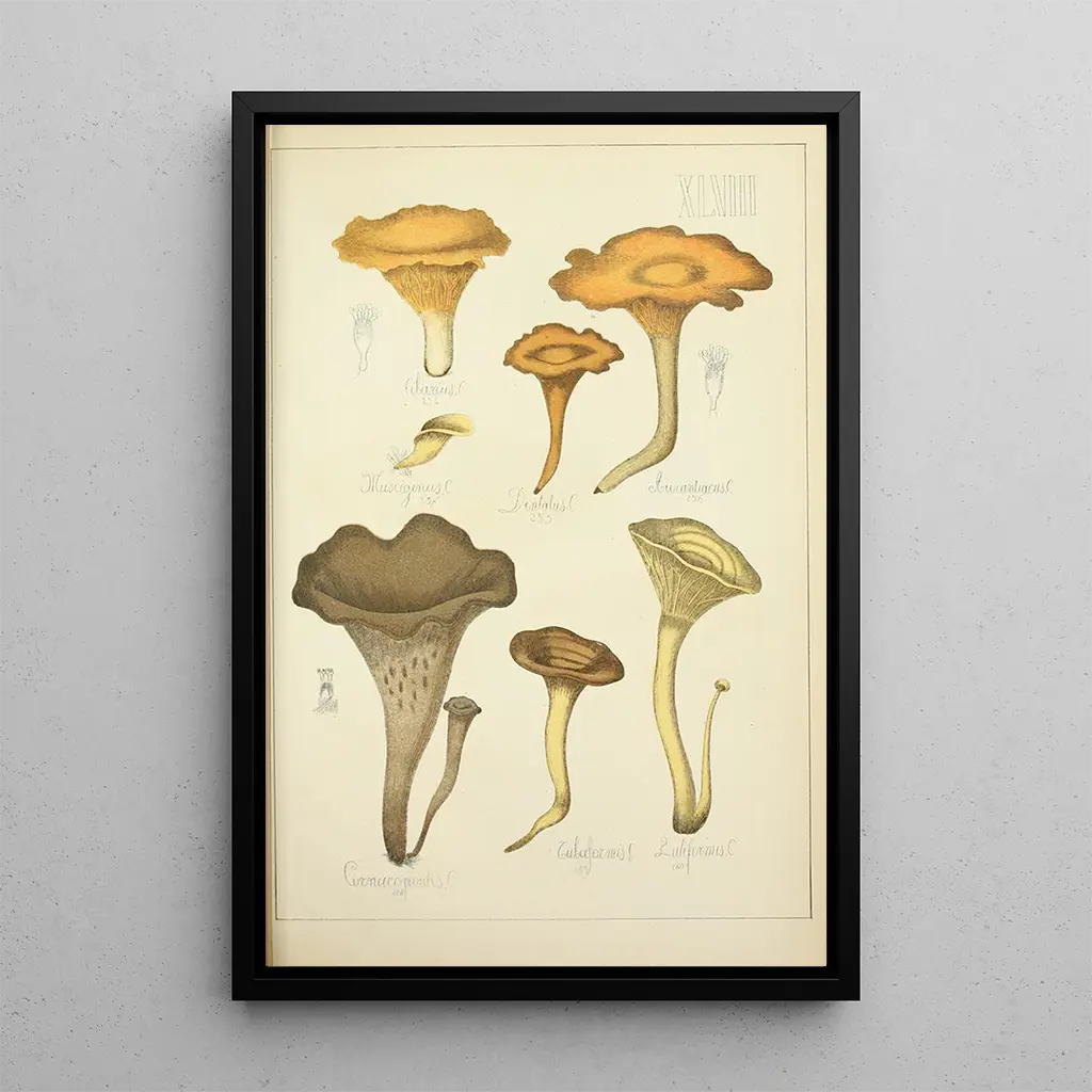 The art print Histoire naturelle des champignons Pl48 by Guillaume Sicard immerses us in a universe where nature reveals itself with rare delicacy. The shades of green, brown, and cream intertwine to create a harmonious composition, evoking the richness of the undergrowth. Every detail, from the organic shapes of the mushrooms to their delicate textures, is rendered with remarkable precision, demonstrating the artist's expertise. The atmosphere emanating from this piece invites attentive contemplation, where one can almost feel the dampness of the earth and the scent of fresh mushrooms.