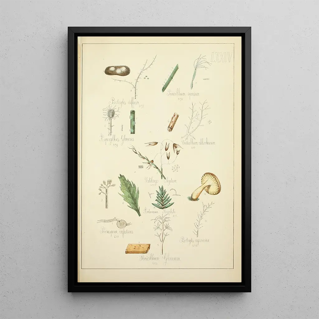 L'œuvre "Histoire naturelle des champignons Pl74" de Guillaume Sicard est une représentation fascinante qui célèbre la richesse des espèces fongiques. Chaque détail est soigneusement élaboré, révélant la complexité et la beauté des champignons, souvent négligés dans le monde végétal. Les teintes vibrantes et les textures délicates créent une atmosphère vivante, presque magique, invitant à une exploration visuelle. Cette art print, à travers sa précision et son esthétisme, évoque l'émerveillement face à la nature et à ses mystères.