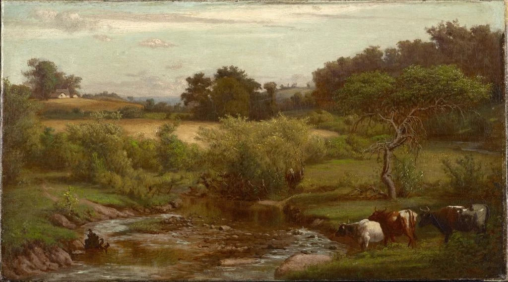 In this art print of Near Yellow Springs, Ohio, Joseph Oriel Eaton captures the tranquil beauty of an American landscape. The soft shades of green and blue blend to create a soothing atmosphere, where light delicately plays on the foliage. The watercolor technique, with its fluid nuances, brings each detail to life, from majestic trees to reflections in the water. This piece invites silent contemplation, allowing the viewer to escape into a world of peace and natural beauty.