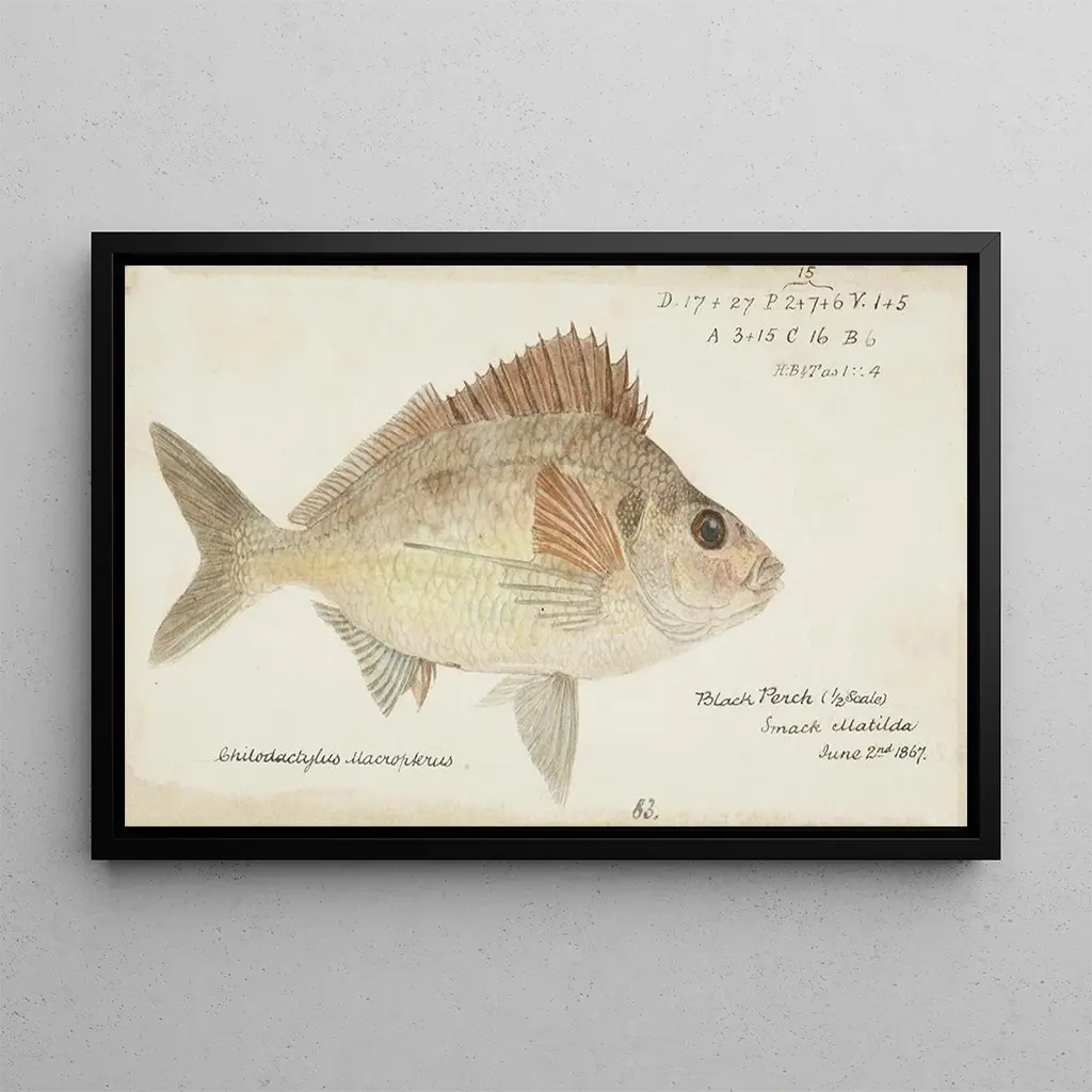 Nemadactylus macropterus, New Zealand tarakihi: a dive into the marine depths The art print of Nemadactylus macropterus, also known as tarakihi, transports us to the crystal-clear waters of New Zealand. This vibrant painting by Frank Edward Clarke captures the very essence of this majestic fish, with its striking colors ranging from golden yellow to deep blue. The artist's technique, blending watercolor and oil, creates a lively and dynamic atmosphere, evoking the fluid movement of water. Every detail, from the shimmering scales to the delicate ripples of the water, is carefully rendered, offering an immersive experience that invites contemplation of marine wonders. Frank Edward Clarke: a pioneer of maritime art Frank Edward Clarke, active in the late 19th and early 20th centuries, is renowned for his contributions to marine art. Influenced by the coastal landscapes of his childhood in New Zealand, he was able to capture the beauty of aquatic fauna with remarkable precision. His style, at the crossroads of realism and impressionism, reflects a time when ocean exploration fascinated the entire world. Clarke managed to immortalize the richness of marine ecosystems, making his works valuable testimonies of the biodiversity of his era. His passion for nature and his commitment to the preservation of marine species still resonate today. A decorative acquisition with multiple assets This art print of Nemadactylus macropterus is a decorative piece that will enhance any space, whether it be a living room, office, or bedroom. Its printing quality guarantees exceptional fidelity to the colors and details of the original work, allowing you to fully enjoy its aesthetic appeal. By incorporating this art print into your decor, you bring a touch of marine elegance and an invitation to serenity. This decorative choice is sure to pique your guests' curiosity and create a soothing atmosphere, while celebrating the beauty of nature.