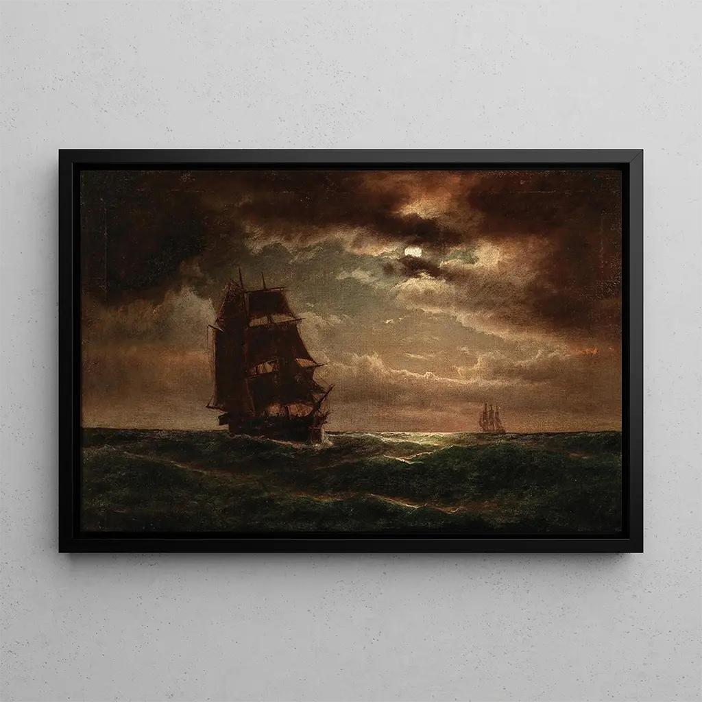 The art print Moonlit Night with Three-Masts evokes a maritime scene filled with mystery and poetry. The moon gently illuminates the sails of the three-masts, creating shimmering reflections on the waves. The dark hues of the sky blend with touches of silver light, offering a striking contrast that captures the eye. Anton Melbye, with his mastery of light and shadow, manages to capture the essence of a peaceful night at sea, where calmness and beauty meet. This piece invites daydreaming, transporting the viewer to distant horizons.