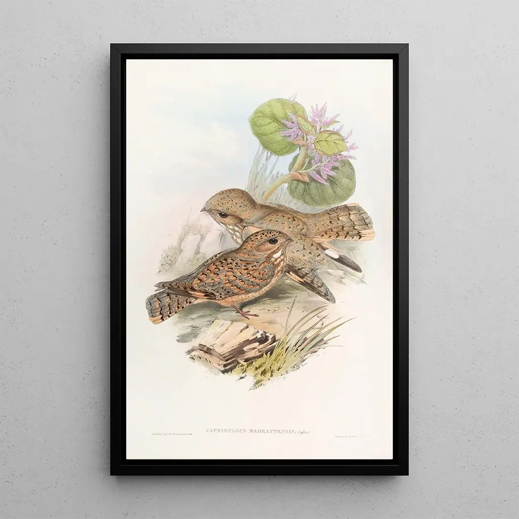 Engoulevent Mahratta: a bird with enchanting plumage The Engoulevent Mahratta, captured through the artistic lens of John Gould, stands as a marvel of nature. Its delicate feathers, blending brown and golden hues, evoke the warmth of exotic landscapes. The composition of this art print is carefully arranged, highlighting the elegance of the bird in its natural habitat. The watercolor technique, executed with mastery, imparts an atmosphere of lightness and poetry, inviting viewers to marvel at the beauty of wildlife. Every detail, from the feathers to the bright eyes, seems to come alive, creating an intimate connection between the artist and his subject. John Gould: the pioneer of artistic ornithology John Gould, a 19th-century British naturalist and ornithologist, is renowned for his significant contributions to the study of birds. His passion for ornithology led him to travel around the world, observing and documenting rare species. Influenced by the romanticism and realism of his era, Gould skillfully combined science and art, producing works that are now references. His work has had a profound impact on species conservation, paying homage to biodiversity. The Engoulevent Mahratta is one of his many masterpieces, demonstrating his dedication to the beauty of nature. A decorative acquisition with multiple assets The art print of the Engoulevent Mahratta is a decorative piece that will enhance your interior. Whether in a living room, office, or bedroom, this artwork adds a touch of exoticism and refinement. Its print quality and color fidelity make it an ideal choice for art and nature enthusiasts. The aesthetic appeal of this canvas attracts the eye and sparks conversations, making this art print a true decorative asset. By integrating this reproduction into your space, you invite the beauty of wildlife to flourish in your home.