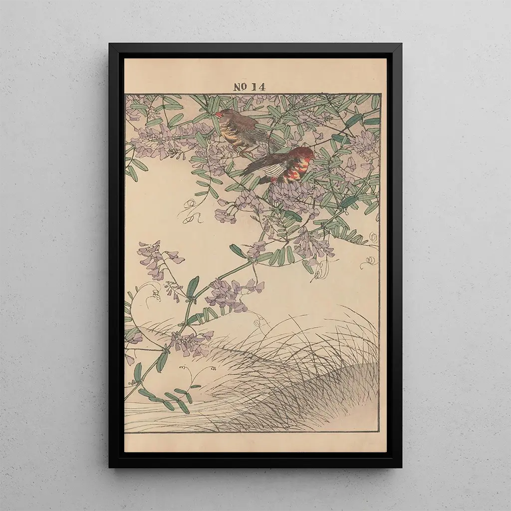Keinen kach gafu Pl016 art print by Imao Keinen is a piece that invites you to immerse yourself in a universe where nature flourishes under a delicate brushstroke. The soft colors and floral motifs intertwine gracefully, creating a soothing atmosphere. The technique of silk painting, typical of the period, gives this canvas a lightness and fluidity that captivate the eye. Every detail, from petals to leaves, is rendered with meticulous precision, making this work a true ode to the ephemeral beauty of nature.