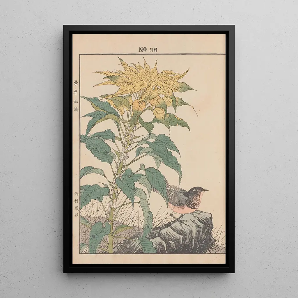 Keinen kach gafu Pl039 art print immerses us in a universe where nature is highlighted with extraordinary delicacy. The soft colors and meticulous details of the flowers and birds create a calming, almost meditative atmosphere. The technique of woodblock printing on paper, typical of the Edo period, allows the artist to capture the ephemeral beauty of Japanese flora and fauna. Each element seems to vibrate under the viewer's gaze, inviting silent and respectful contemplation of nature.