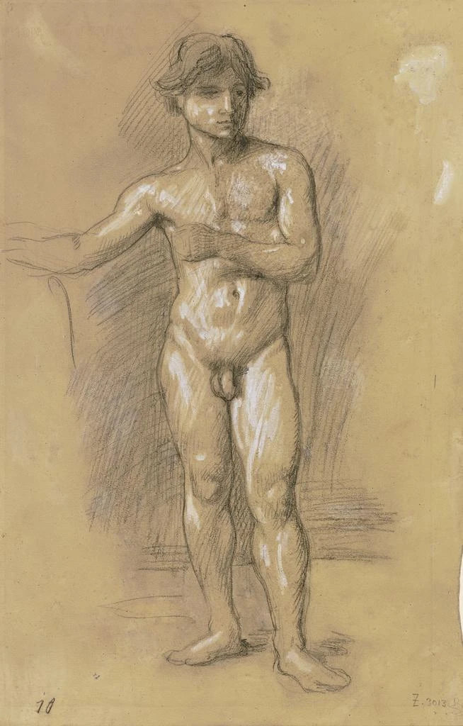 Hans von Marées, a German painter of the 19th century, is often associated with the romantic realism movement. Trained at the Düsseldorf Academy of Fine Arts, he was influenced by artists such as Friedrich and the Renaissance masters. His work is distinguished by a constant pursuit of ideal beauty, blending elements of classicism with modern sensitivity. Although less well-known than some of his contemporaries, Marées left a lasting mark on German art, exploring themes of the human condition through poignant compositions. "Nude of a Standing Young Man" is a perfect example of his approach, where harmony between man and art is emphasized.