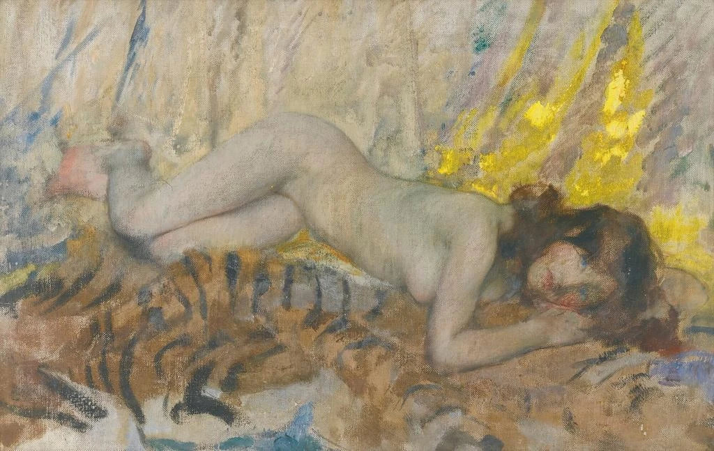 James Jebusa Shannon, an American painter of British origin, marked the end of the 19th century and the beginning of the 20th century with his unique style, blending realism and impressionism. Influenced by the artistic movements of his time, he captured intimate moments with particular sensitivity. His work, often focused on portraits and nudes, reflects an era when the depiction of women was both a subject of fascination and controversy. "Nude on a tiger skin" perfectly illustrates his talent, combining sensuality and sophistication, while also reflecting the artistic evolutions of his time.