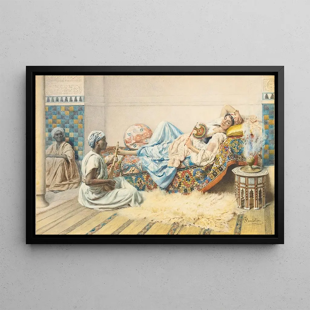 The Odalisque, an iconic work by Federico Bartolini, evokes delicate sensuality and a dream of the Orient. The composition features a reclining woman, surrounded by sumptuous drapes and exotic motifs. The rich colors, ranging from warm tones to deep shades, create an intimate and mysterious atmosphere. Bartolini's technique, characterized by fluid brushstrokes and meticulous attention to detail, brings this female figure to life while conveying a sense of calm and serenity. This art print invites contemplation and escapism into a world of beauty.