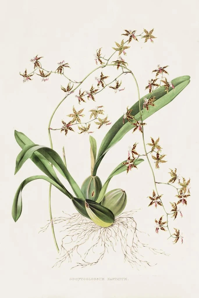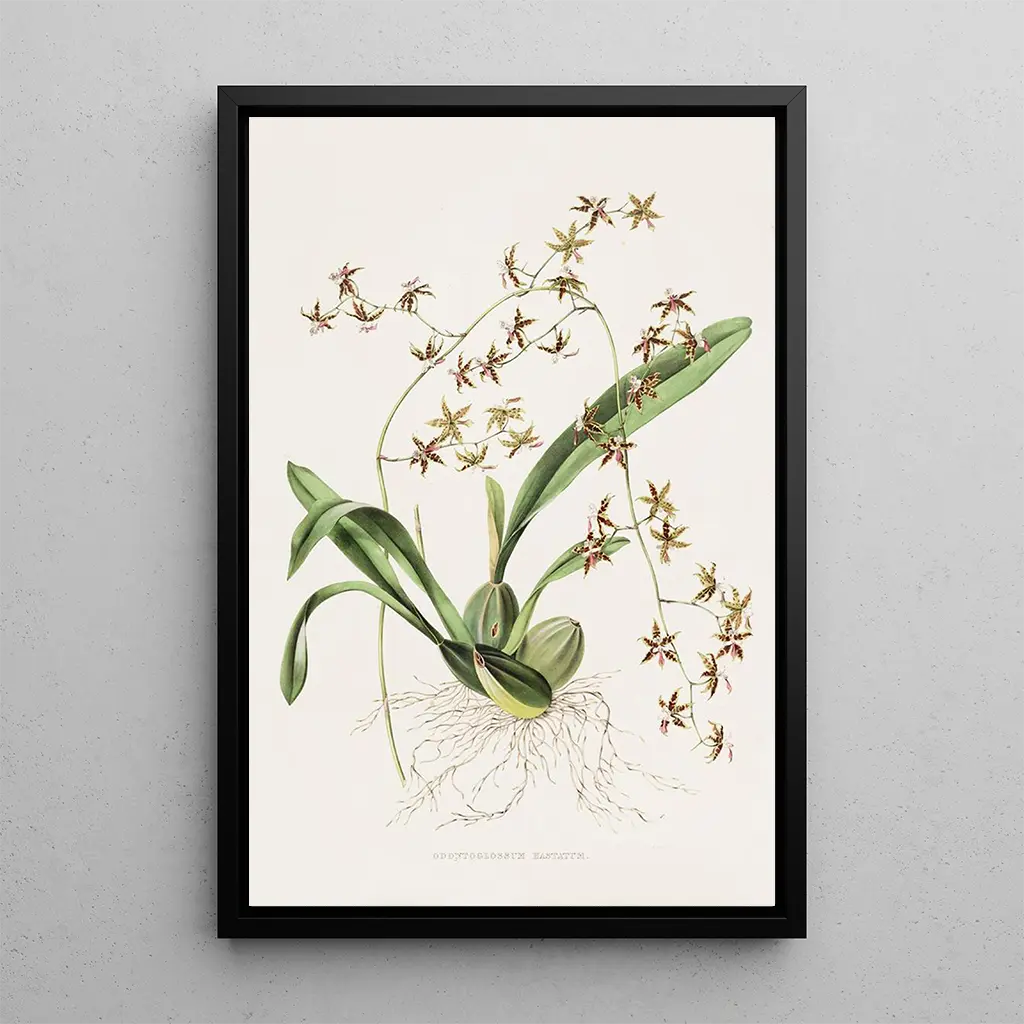 Odontoglossum Hastatum: a floral delicacy to admire The Odontoglossum Hastatum, a captivating work by James Bateman, immerses us in a floral world filled with grace and subtlety. This art print reveals delicate shades of white and violet, creating a soothing and harmonious visual effect. The watercolor technique used by Bateman captures the transparency of the petals and the texture of the leaves, offering an almost dreamlike atmosphere. Every detail is carefully highlighted, inviting the viewer to marvel at the fragile beauty of this orchid, a symbol of refinement and sophistication. James Bateman: an artist at the crossroads of science and art James Bateman, active in the 19th century, is recognized not only as an artist but also as a passionate botanist. His work is set in a context where the study of plants and their artistic representation are experiencing unprecedented growth. Influenced by the botanical discoveries of his time, Bateman knew how to marry his love for nature with his artistic talent, creating works that celebrate the diversity of species. The Odontoglossum Hastatum is a perfect example of his approach, combining scientific precision and aesthetic appeal, making him a pioneer in the field of floral art. A decorative acquisition with multiple advantages The art print of the Odontoglossum Hastatum is a perfect decorative choice to bring a touch of nature into your interior. Whether in a living room, office, or bedroom, this piece will appeal through its print quality and fidelity to the original work. Its aesthetic appeal and soft colors make it a decorative element that harmoniously fits into various interior design styles. By choosing this canvas, you give your space a serene and elegant atmosphere, while paying tribute to botanical art.