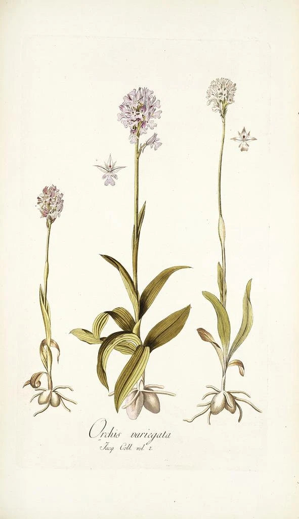 Nikolaus Joseph Freiherr von Jacquin, botanist and artist of the 18th century, managed to combine science and art in his works. Born in 1727 in Austria, he was influenced by the botanical discoveries of his time and traveled around the world to study flora. His illustrations, including Orchis variegata, are considered references in the field of botanical illustration. Jacquin contributed to the knowledge of exotic plants in Europe, and his work has had a lasting impact on art and science, making him an emblematic figure of his era.