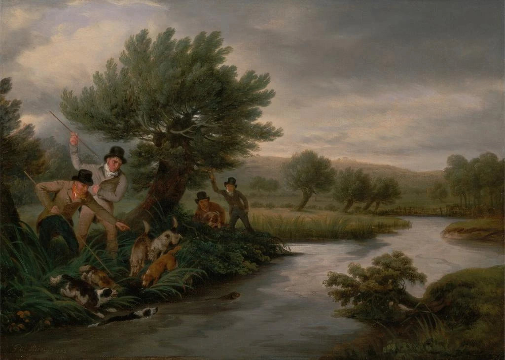In this captivating artwork, Philip Reinagle immerses us in a hunting scene where the intensity of the moment is palpable. The rich and vibrant colors, ranging from the deep greens of the foliage to the earthy browns of the rocks, create an atmosphere that is both dynamic and serene. The oil painting technique allows for remarkable detail in the otter's fur and the reflections on the water. This art print of "Harpoon Capture of the Otter" invites contemplation of the beauty of nature and the artist's skill in capturing a fleeting moment.