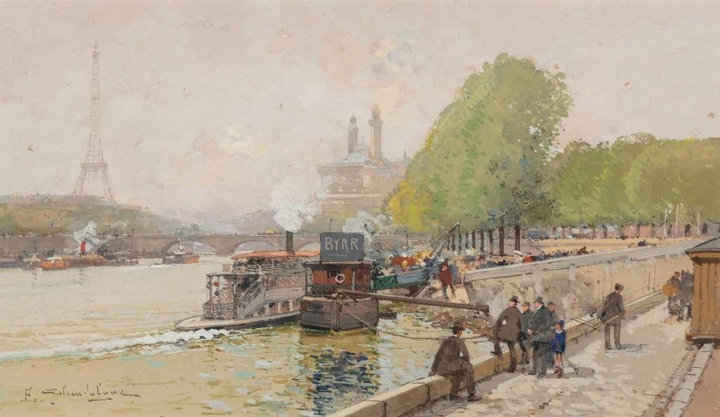 The art print "Quai de Passy" by Eugène Galien-Laloue immerses us in a peaceful atmosphere, where the Seine gently meanders under a cloudy sky. The soft colors and shades of blue and gray evoke a tranquil day in Paris, while the touches of light illuminate the moored boats and the silhouettes of passersby. Galien-Laloue's impressionist technique, with its delicate brushstrokes, creates a sense of movement and life, making this art print captivating. This piece invites contemplation, allowing the viewer to escape into a suspended moment by the water.