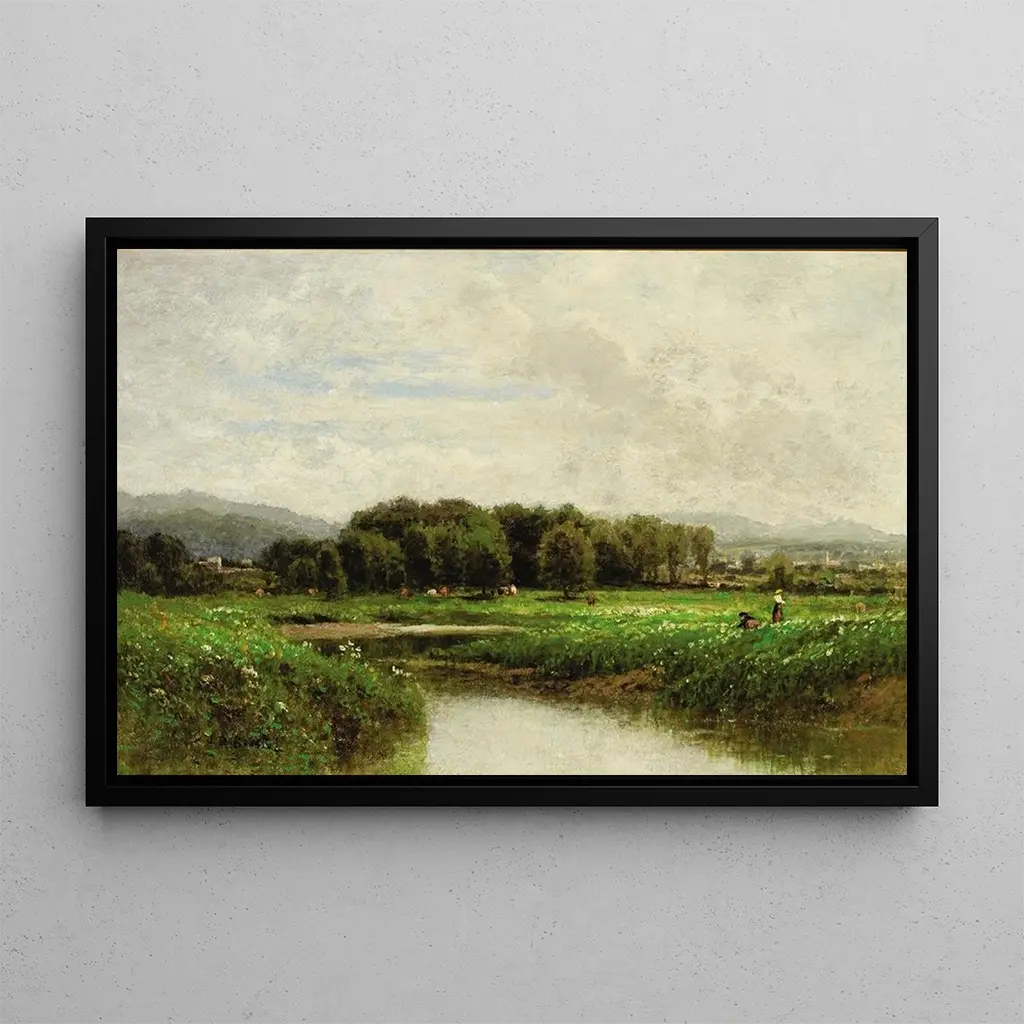 Pastoral landscape: an ode to bucolic tranquility The art print of Pastoral landscape immerses the viewer in a vibrant tableau of serenity and natural beauty. The verdant hues and soft shades of the sky create a peaceful atmosphere, where time seems to stand still. The composition, balanced and harmonious, invites an escape to distant lands, where nature reigns supreme. The meticulous details of the trees and hills, combined with delicate lighting, evoke a sense of calm and fullness. This painting, a true homage to nature, is an invitation to contemplation and daydreaming. John Bunyan Bristol: an artist at the heart of the pastoral movement John Bunyan Bristol, active during the 19th century, is renowned for his evocative landscapes that capture the essence of rural life. Influenced by Romanticism, he fits into an artistic tradition that values nature and simplicity. His works, often imbued with nostalgia, reflect a time when industrialization was beginning to transform the English landscape. Celebrating the beauty of the countryside, Bristol reminds us of the importance of connecting with nature. His artistic legacy remains alive through his art prints, which continue to inspire art lovers and bucolic landscapes enthusiasts. A decorative acquisition with multiple assets The art print of Pastoral landscape is an ideal choice to enrich your interior. Whether in a living room, office, or bedroom, it brings a warm and soothing ambiance. Its printing quality ensures fidelity to the nuances and details of the original artwork, while seamlessly integrating into contemporary decor. By choosing this art print, you add a touch of elegance and serenity to your space, while creating a captivating focal point for your guests. This pastoral landscape is much more than simple decoration; it is an invitation to peace and contemplation.