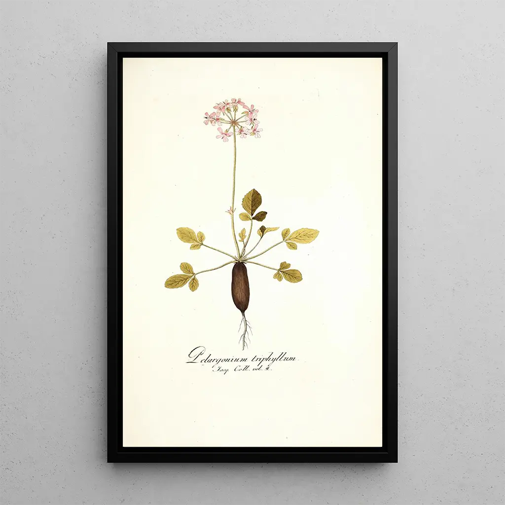 Pelargonium triphyllum: a journey into the heart of flora The art print of Pelargonium triphyllum transports us to a lush garden, where vibrant shades of flowers bloom in a colorful dance. The dazzling hues of violet and pink blend harmoniously, while the leaves, in a deep green, provide a striking contrast. The watercolor technique, used with finesse, creates a light and airy atmosphere, inviting contemplation of natural beauty. Every detail, from the veins of the petals to the delicate shadows, is rendered with precision that highlights the artist's expertise. Nikolaus Joseph Freiherr von Jacquin: a master of botanical art Nikolaus Joseph Freiherr von Jacquin, botanist and artist of the 18th century, played a key role in the development of botanical art. His training in medicine and botany allowed him to explore nature with a scientific eye, while translating this passion into works of art. His travels in America and the Caribbean enriched his repertoire, enabling him to discover rare and exotic species. Jacquin was able to combine scientific accuracy with artistic sensitivity, making him an iconic figure of his time and a pioneer in floral representation. A decorative acquisition with multiple advantages The art print of Pelargonium triphyllum is a perfect choice to enhance your living space. Whether in a living room, office, or bedroom, this piece adds a touch of color and nature, creating a warm and welcoming atmosphere. Its printing quality ensures fidelity to the details and colors of the original artwork, while offering undeniable aesthetic appeal. By incorporating this canvas into your decor, you choose a piece that evokes the beauty of nature and enriches your interior with an elegant floral note.