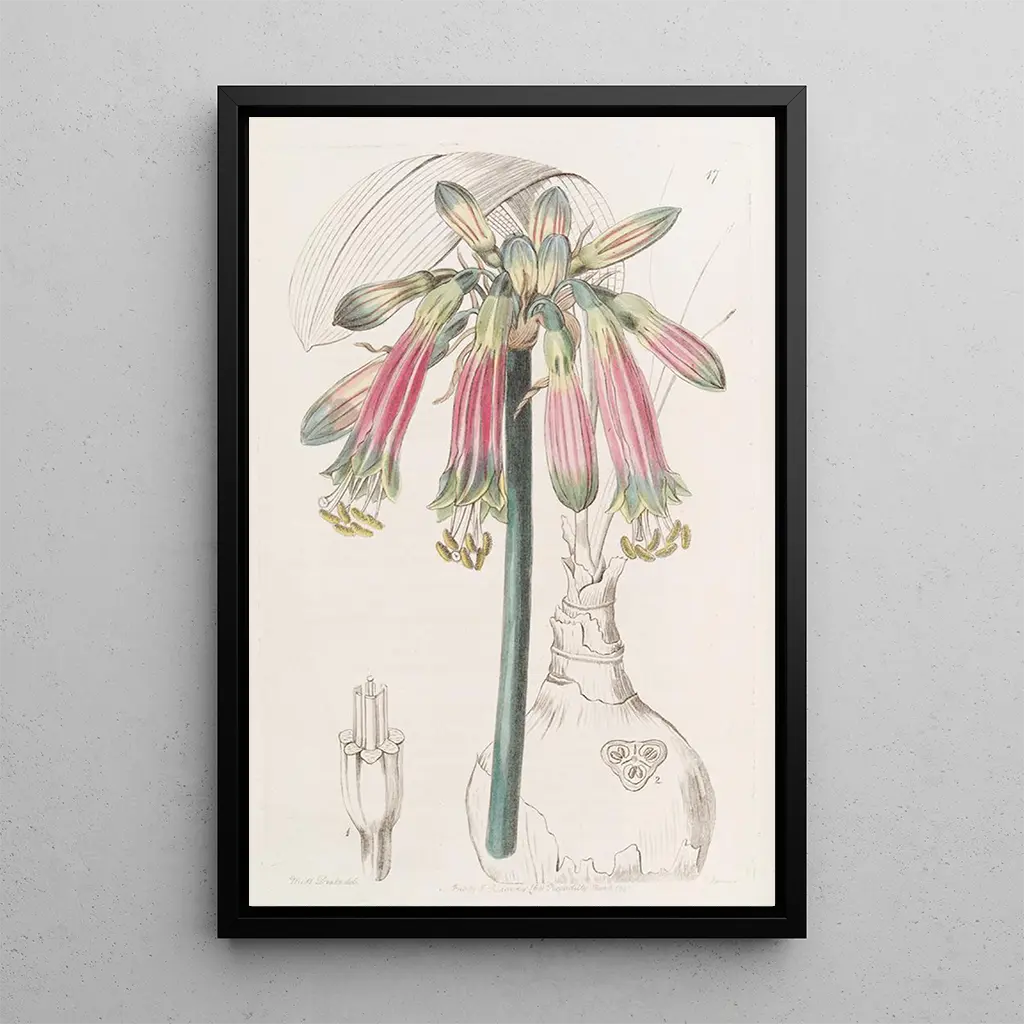 Phaedranassa crimson and green: a burst of vibrant colors In this captivating artwork, Sydenham Edwards immerses us in the heart of lush nature where the Phaedranassa crimson and green flourishes in all its splendor. The bright shades of red and green blend harmoniously, creating a lively tableau that captures the eye and awakens the senses. The watercolor technique, used with finesse, allows for the delicacy of the petals and the richness of the foliage to be rendered. The atmosphere conveyed by this art print is both joyful and soothing, inviting a serene contemplation of natural beauty. Sydenham Edwards: a pioneer of botanical illustration Sydenham Edwards, active in the early 19th century, is recognized as one of the great botanical illustrators of his time. Influenced by the Romantic movement, he captured the beauty of plants with scientific precision while infusing an artistic touch. His works, often published in reference books, testify to the importance of botany at that time, when the exploration of exotic plants fascinated Europeans. Edwards contributed to the rise of botanical illustration, combining art and science, and his legacy endures through his creations. A decorative acquisition with multiple assets The art print of Phaedranassa crimson and green is an ideal decorative piece to enhance your interior, whether in a living room, office, or bedroom. Its print quality and fidelity to the original colors make it an attractive choice for art and nature enthusiasts. This canvas adds a touch of freshness and elegance, while inspiring admiration from your guests. By choosing this artwork, you opt for a decorative element that combines aesthetics and history, transforming your space into a true haven of peace.