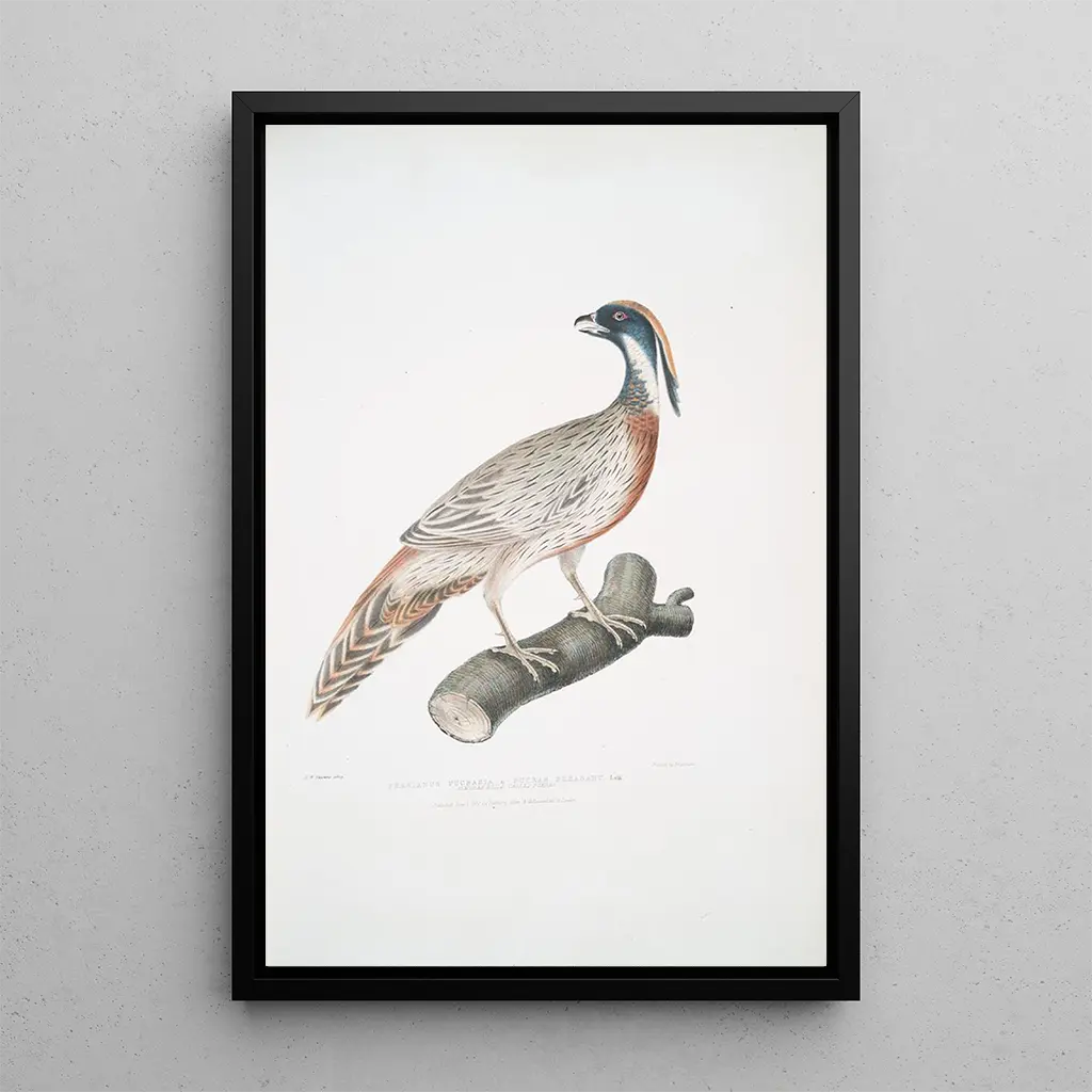 Faisan Pucras Phasianus Pucrasia : an explosion of exotic colors The art print of the Pucras Pheasant, a work by John Edward Gray, transports us into a vibrant world of colors and textures. This painting highlights the majesty of this bird with shimmering feathers, where red, blue, and gold intertwine brilliantly. The watercolor technique captures the brilliance of the colors and the finesse of the details, creating an almost fairy-tale atmosphere. Every element is carefully crafted, inviting the viewer to admire the beauty of wild nature and to marvel at the richness of biodiversity. John Edward Gray : a craftsman of ornithological beauty John Edward Gray, an emblematic figure of the 19th century, is renowned for his contributions to ornithology and art. His scientific approach, combined with a keen artistic sense, allowed him to create works that capture the very essence of birds. The Pucras Pheasant is a perfect example of his talent, illustrating not only the beauty of the bird but also the importance of wildlife conservation. Gray managed to immortalize often little-known species, thus contributing to a better understanding of our natural environment. A decorative acquisition with multiple assets The art print of the Pucras Pheasant is a bold decorative choice that will enrich any space. Whether in a living room, dining room, or office, this canvas adds a touch of exoticism and sophistication. Its printing quality guarantees color fidelity and detail, captivating everyone's attention. By incorporating this artwork into your decor, you create a focal point that sparks curiosity and admiration, while celebrating the beauty of nature and the art of ornithological illustration.