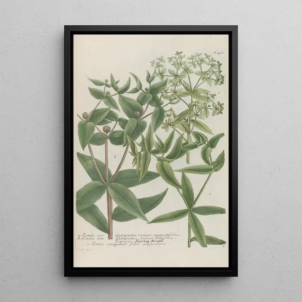 The art print of Phytanthoza iconographia Pl213 transports us into a world where each plant is celebrated with exceptional detail. The vibrant hues and delicate shapes of the illustrated plants create a lively and dynamic atmosphere. This piece, through its detailed approach, invites attentive contemplation, revealing the complexity and beauty of flora. Johann Wilhelm Weinmann's engraving technique captures the very essence of the plants, making this artwork a true botanical art print that awakens the senses and stimulates the imagination.