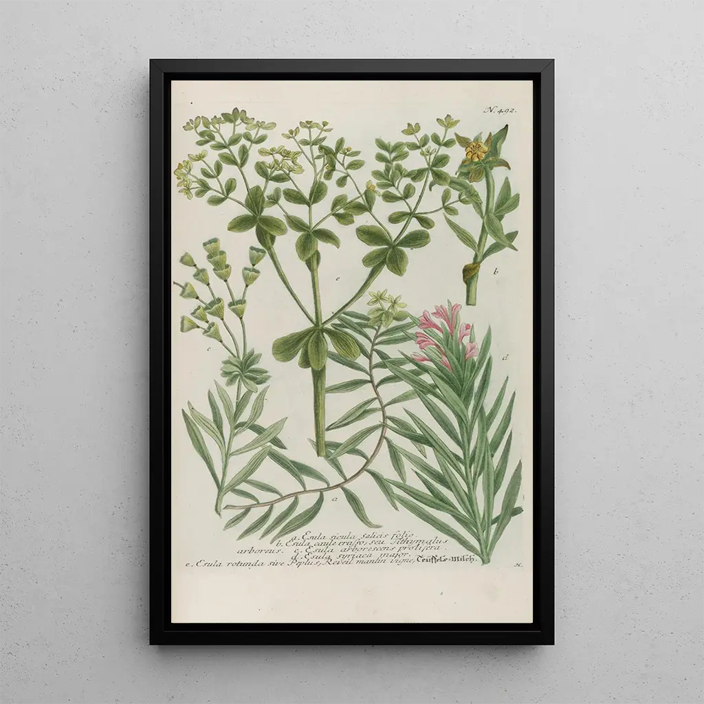 Phytanthoza iconographia Pl215: a fascinating botanical exploration The art print of the work Phytanthoza iconographia Pl215 transports us into a world where flora is highlighted with remarkable precision. The illustrations, strikingly clear, showcase a variety of plants with diverse shapes and colors, creating a lively and dynamic atmosphere. The engraving technique, enhanced with touches of watercolor, gives each plant an almost tactile dimension, inviting exploration. The piece not only celebrates the beauty of nature but also emphasizes the importance of botanical documentation at a time when science and art were intertwined. Johann Wilhelm Weinmann: a master of botanical art Johann Wilhelm Weinmann, active in the 18th century, is an iconic figure in botanical illustration. His flagship work, Phytanthoza iconographia, is the result of a passion for botany and a quest for knowledge. Influenced by exploration voyages and scientific discoveries of his era, Weinmann captured the essence of exotic plants with impressive realism. His legacy endures, as his works continue to inspire botanists and artists alike, demonstrating the significance of art in understanding the natural world. A decorative acquisition with multiple advantages The art print of Phytanthoza iconographia Pl215 is a valuable addition to any art collection or interior decor. Whether in a living room, office, or bedroom, this canvas adds a touch of elegance and serenity. Its printing quality ensures fidelity to the details of the original work, while offering a refined aesthetic. By choosing this piece, you invite the beauty of nature into your living space, creating an inspiring and soothing environment. This artwork is not only a decorative element but also a celebration of biodiversity that enriches your interior.
