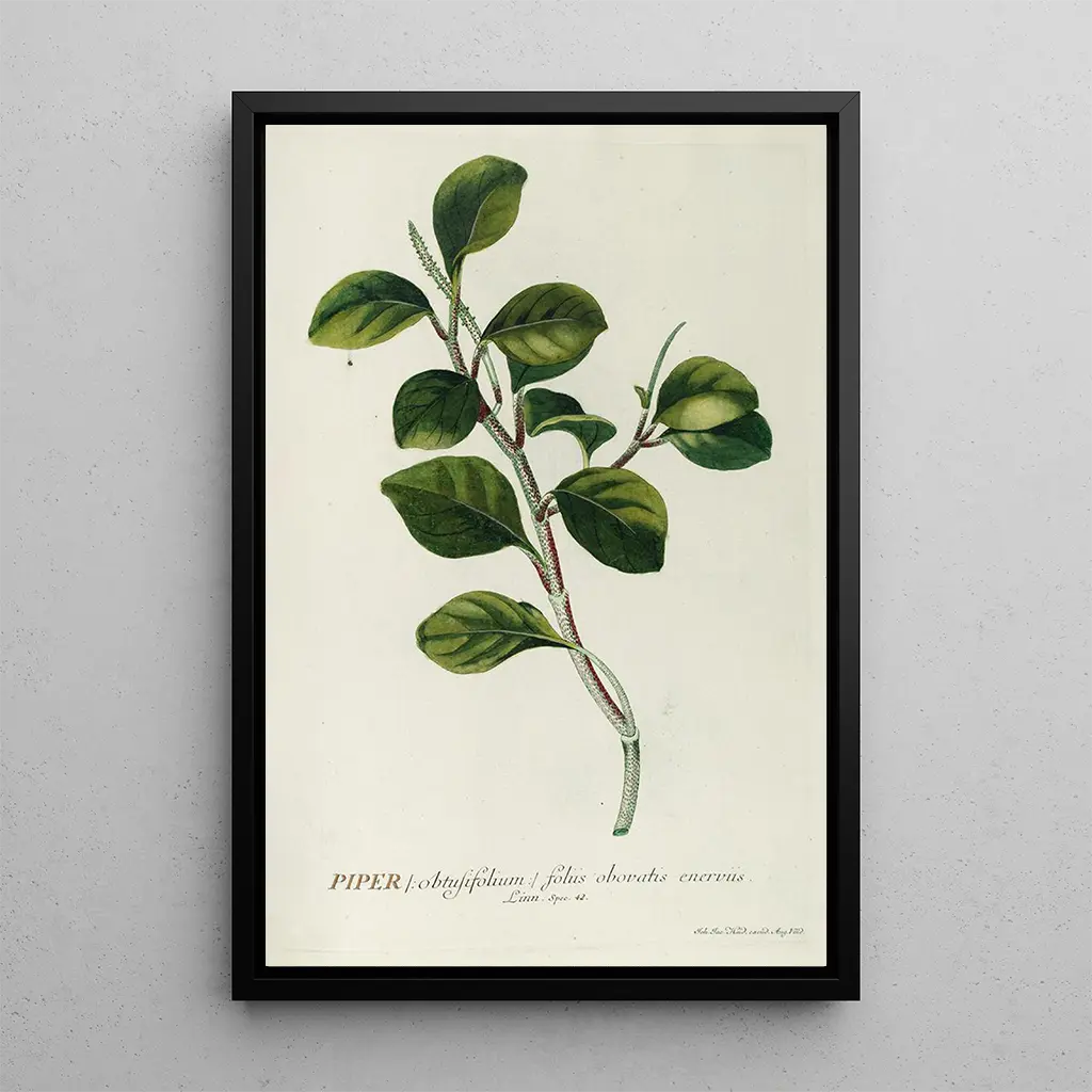 The art print of Piper, an iconic work by Georg Dionysius Ehret, immerses us in a fascinating botanical universe. The meticulous details of the leaves and stems blend with a palette of vibrant greens, creating an atmosphere that is both soothing and dynamic. The copper engraving technique used by the artist captures the delicacy of natural textures, while the light appears to play on the surfaces, bringing this composition to life. Each element of this canvas invites observation, contemplation of the wonders of nature, as if one could almost smell the scent of the plants.
