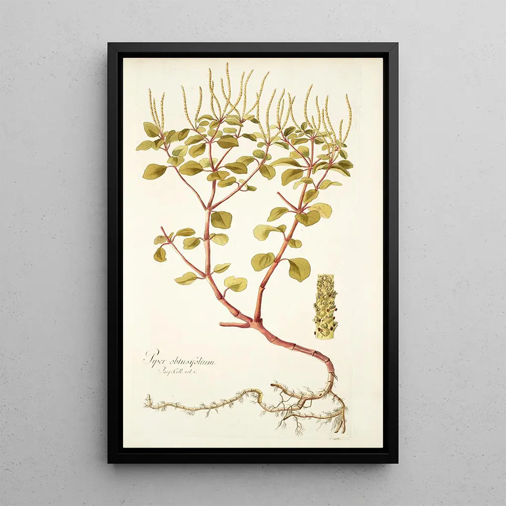 Piper obtusifolium : an ode to tropical nature The art print of Piper obtusifolium, created by Nikolaus Joseph Freiherr von Jacquin, immerses us in a fascinating botanical universe. This artwork highlights the beauty of the plant's broad, glossy leaves, capturing the light in a way that evokes the warmth of the tropics. The shades of green, ranging from light to dark, create a striking contrast that draws the eye. The watercolor technique, used with finesse, renders the delicate texture of the leaves while infusing an atmosphere of serenity and wonder. This piece is a true celebration of biodiversity, inviting contemplation of the marvels of nature. Nikolaus Joseph Freiherr von Jacquin: a pioneer of botany Nikolaus Joseph Freiherr von Jacquin, an 18th-century botanist and artist, played a crucial role in the study of exotic plants. Originating from Austria, he traveled to South America, where he collected specimens and created detailed illustrations. His work is part of the Enlightenment movement, where scientific curiosity and exploration of the natural world were celebrated. Jacquin influenced many botanists and artists of his time, and his works continue to be a reference in the field of botanical illustration. The art print of Piper obtusifolium bears witness to his talent and his dedication to science and art. A decorative acquisition with multiple assets The art print of Piper obtusifolium is an ideal decorative choice to bring a touch of greenery and exoticism to your interior. Whether in a living room, office, or bedroom, this artwork integrates harmoniously into various decorating styles, from contemporary to classic. Its printing quality guarantees fidelity to the colors and details of the original work, while offering undeniable aesthetic appeal. By choosing this canvas, you not only beautify your space but also invite a piece of nature inside, creating a calming and inspiring atmosphere.