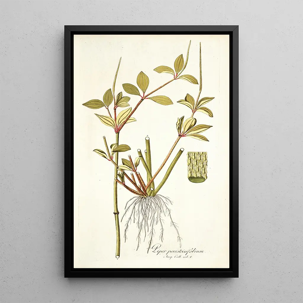 Piper pereskiaefolium: a celebration of plant diversity The art print of Piper pereskiaefolium, a work by Nikolaus Joseph Freiherr von Jacquin, transports us into a lush world where the diversity of shapes and colors flourishes. This piece highlights the fleshy leaves and sturdy stems of the plant, perfectly illustrating its adaptation to tropical environments. The vibrant shades of green, accented with touches of yellow and brown, evoke the richness of tropical flora. The watercolor technique, mastered by Jacquin, captures the light and texture, creating a lively and dynamic atmosphere. This artwork is an invitation to explore the wonders of nature and to appreciate its unique beauty. Nikolaus Joseph Freiherr von Jacquin: an artist dedicated to science Nikolaus Joseph Freiherr von Jacquin, an 18th-century Austrian botanist and artist, is renowned for his contributions to botanical illustration. His travels in South America allowed him to discover and document a multitude of plants unknown in Europe. His work is set within the Enlightenment context, where scientific exploration and curiosity about the natural world were flourishing. Jacquin successfully combined art and science, influencing many contemporaries and future botanists. The art print of Piper pereskiaefolium testifies to his exceptional talent and his commitment to botanical knowledge. A decorative acquisition with multiple assets The art print of Piper pereskiaefolium is a decorative choice that will enrich your living space. Whether in a living room, office, or bedroom, this canvas adds a touch of exoticism and freshness. Its printing quality ensures remarkable fidelity to the colors and details of the original artwork, while offering undeniable aesthetic appeal. By integrating this piece into your decor, you create an inspiring and soothing environment, while celebrating the beauty of nature. This artwork is much more than simple decoration; it is a true conversation piece that will pique the curiosity of your guests.
