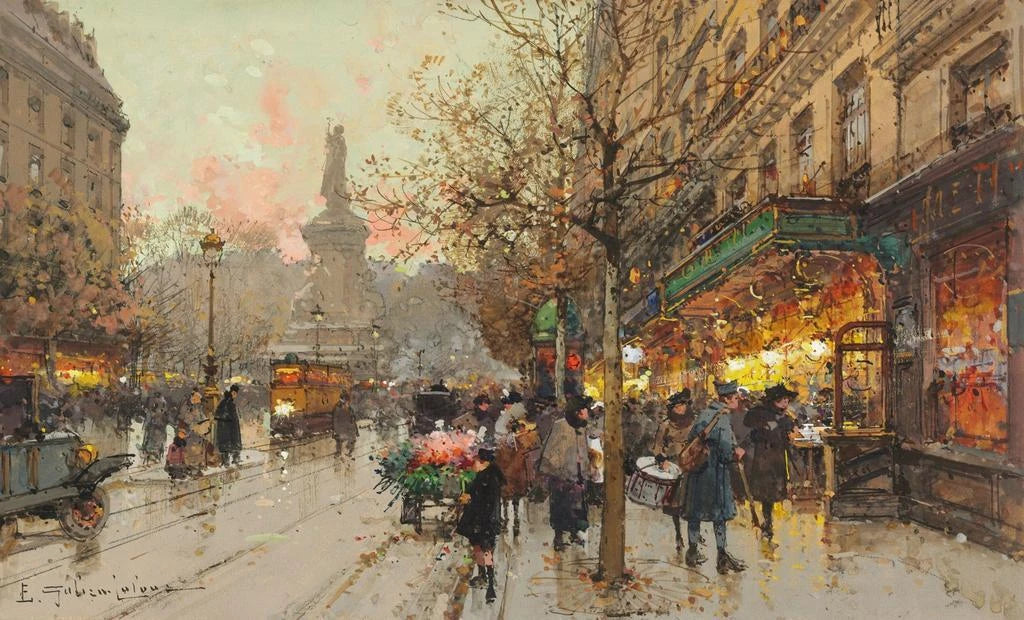 Eugène Galien-Laloue, actif à la fin du XIXe siècle et au début du XXe siècle, est reconnu pour ses représentations de la vie parisienne. Influencé par l'impressionnisme, il parvient à capturer la lumière et le mouvement avec une grande finesse. Ses œuvres, souvent empreintes de nostalgie, témoignent d'une époque où Paris était en pleine transformation. Galien-Laloue a su immortaliser des scènes de la vie quotidienne, faisant de ses tableaux des témoins précieux de l'histoire de la capitale française. Son style unique a marqué son époque et continue d'inspirer les amateurs d'art.
