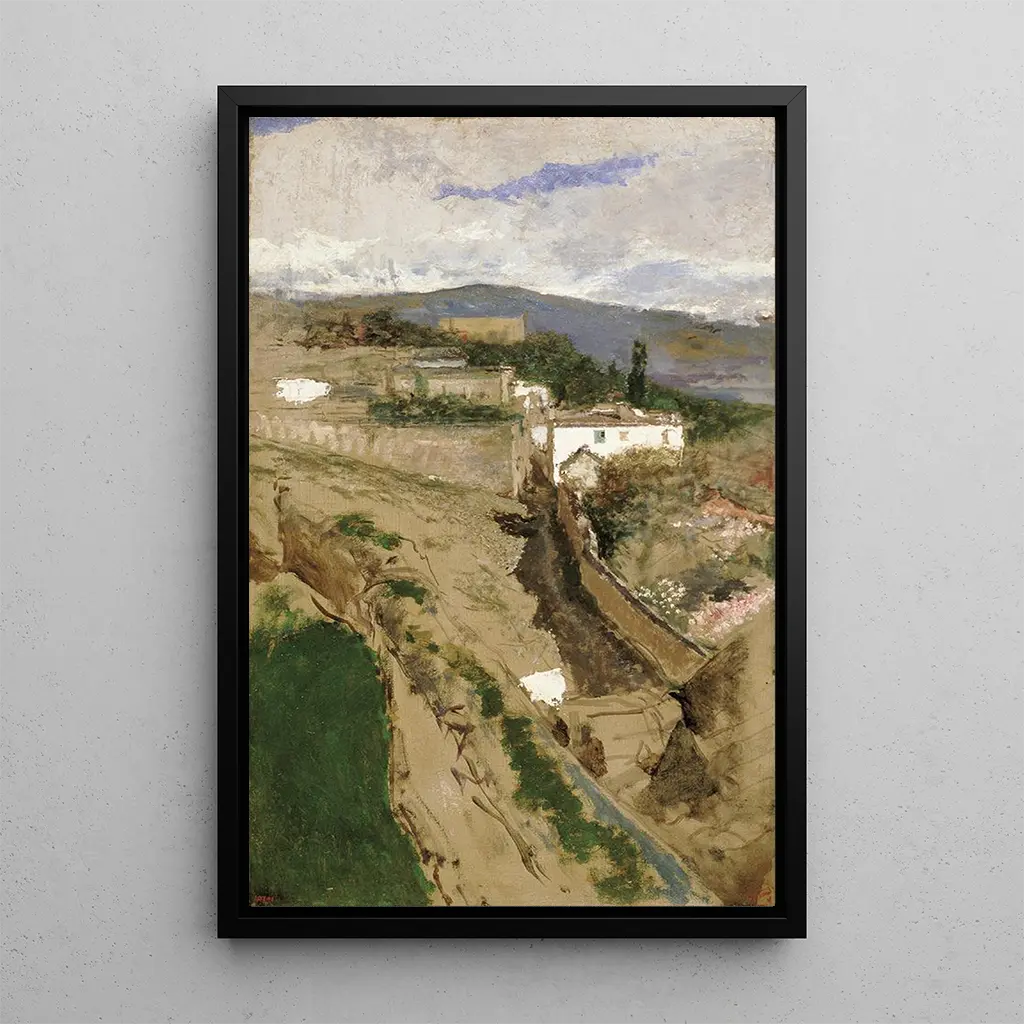 Discover the timeless beauty of the "Grenada Landscape" art print by Mariano Fortuny Marsal, a true celebration of Andalusian light. The composition, rich in detail, immerses us in a vibrant scene where light plays a central role. The warm colors, ranging from ochres to deep greens, evoke a serene and enchanting atmosphere. Fortuny, a master of light, employs painting techniques that capture the glow of the Andalusian sun, making each element of the art print come alive. This landscape, both realistic and poetic, invites the viewer to silent contemplation and a journey to distant horizons.