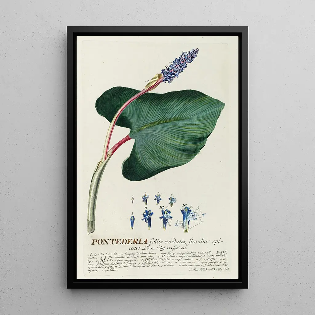 The art print of Pontederia by Georg Dionysius Ehret is a celebration of aquatic life, where vibrant hues and fluid shapes come together. This piece highlights the beauty of the flowers of this aquatic plant, with striking details that capture light and water. The rich colors, ranging from violet to green, create a dynamic and lively atmosphere, inviting viewers to explore the mysteries of aquatic ecosystems. The engraving technique used by Ehret allows each element to be rendered with precision that evokes the delicacy of nature.