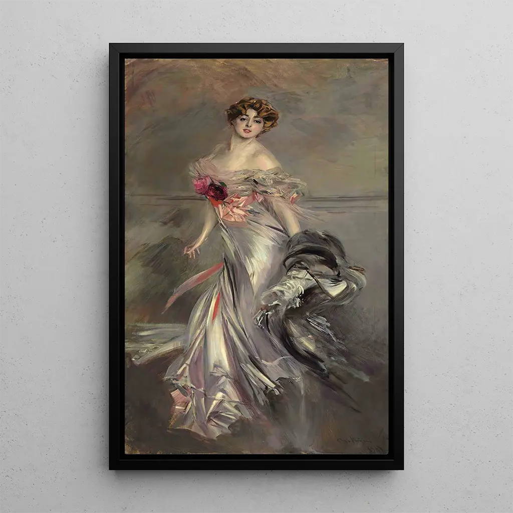 The art print "Portrait of Marthe Régnier" by Giovanni Boldini captures the very essence of feminine beauty through a dynamic composition and vibrant colors. The canvas depicts Marthe Régnier in an elegant pose, wrapped in flowing drapery that seems to dance around her. Bold brushstrokes and impressionist technique give the work a lively atmosphere, where light plays a crucial role, highlighting the delicate features of the model's face. Boldini, master of the portrait, succeeds in immortalizing not only Marthe's appearance but also her spirit and personality, creating a true invitation to contemplation.