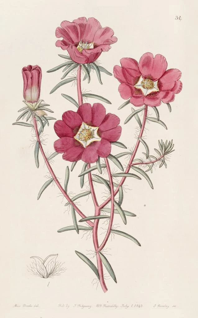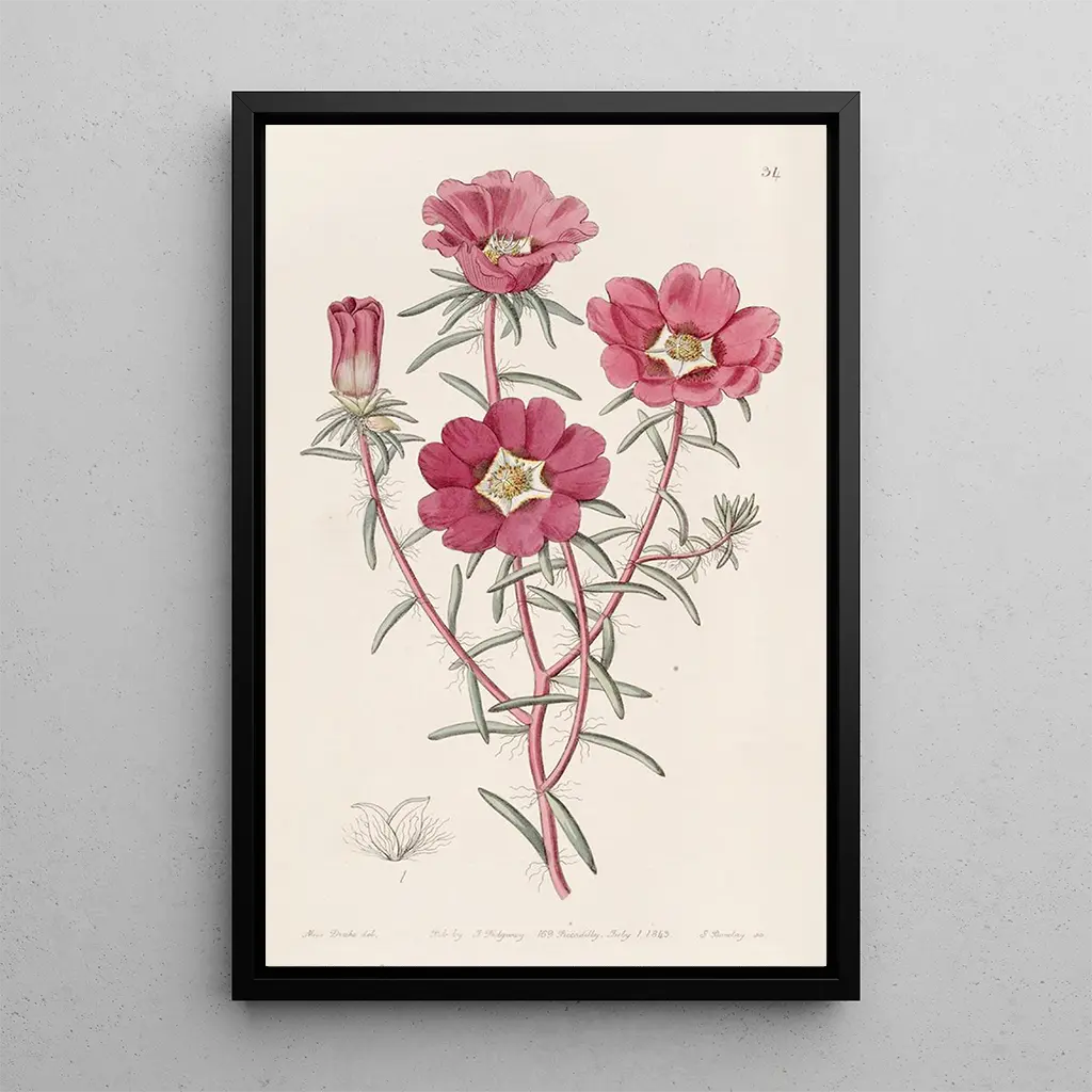 The art print of Portulaca splendide transports us to a midsummer garden, where vibrant shades of yellow, orange, and red bloom under the sun. Each flower, painted with meticulous precision, seems to capture the light, creating a dazzling visual spectacle. The watercolor technique used by Sydenham Edwards gives this piece a soft and delicate texture, evoking the lightness of petals in the breeze. This canvas is a true ode to nature, celebrating the ephemeral beauty of flowers.