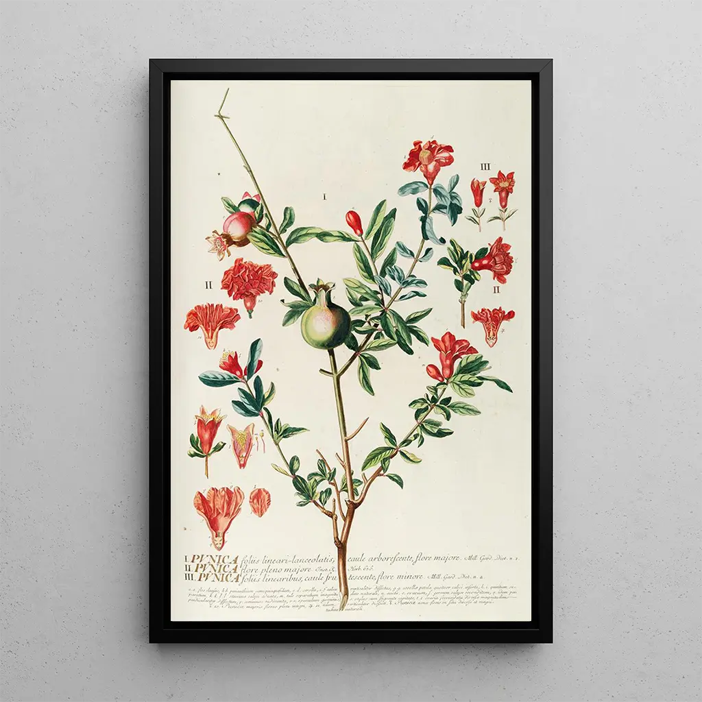 Punica: A Tribute to the Richness of Pomegranate Trees The art print Punica by Georg Dionysius Ehret is a captivating piece that highlights the majesty of the pomegranate. With its vibrant fruits and flamboyant flowers, this canvas evokes the richness and diversity of nature. The warm colors, ranging from bright red to vivid green, create a lively and dynamic atmosphere. The composition is carefully balanced, with each element depicted with precision that reflects Ehret's talent. This work invites deep contemplation, celebrating the ephemeral beauty of fruits and flowers. Georg Dionysius Ehret: A Master of Botanical Art Georg Dionysius Ehret, an iconic figure of the 18th century, left a significant mark on the history of botanical art through his innovative and scientific approach. Originating from Germany, he skillfully combined scientific rigor with artistic sensitivity, influencing many artists and botanists. His illustrations, including Punica, are not only works of art but also valuable scientific documents that contributed to the understanding of plants. Ehret captured the very essence of nature, making him a pioneer whose legacy endures to this day. A Decorative Acquisition with Multiple Benefits Choosing an art print of Punica is to enrich your interior decor with a unique and lively piece. Whether in a living room, office, or bedroom, this artwork adds a touch of color and nature that brightens the space. The quality of the print ensures remarkable fidelity to the details and colors of the original work, allowing you to enjoy Ehret's art daily. By integrating this canvas into your decor, you create a warm and welcoming atmosphere while paying homage to the beauty of pomegranate trees.