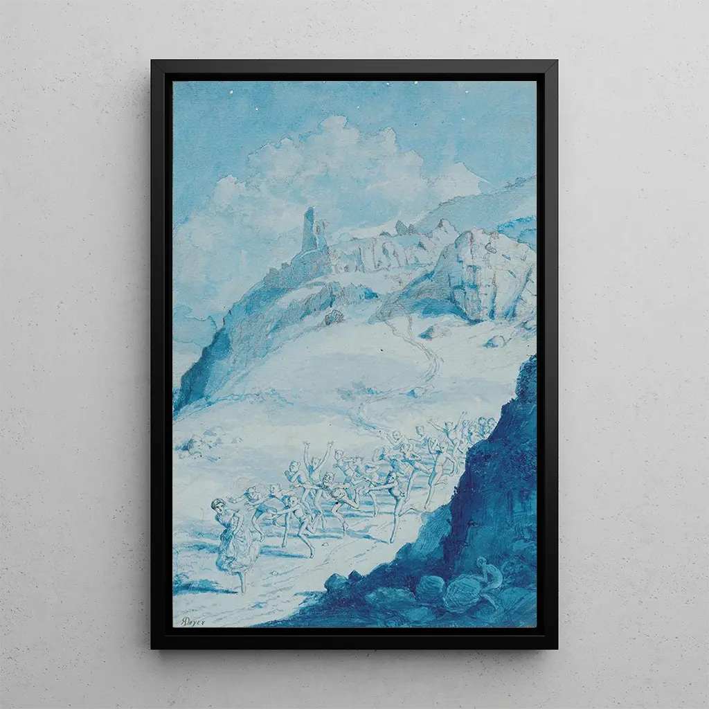 The art print "Pursued by elves" by Richard Doyle immerses us in an enchanting world where reality and fantasy intertwine. With delicate pastel colors and a dynamic composition, Doyle creates a lively scene where playful and graceful elves seem to dance around a young man. The artist's technique, blending watercolor and drawing, brings to life intricate details, making each character and natural element almost tangible. This piece evokes an atmosphere of magic and mystery, inviting the viewer to escape into a fairy-tale universe.