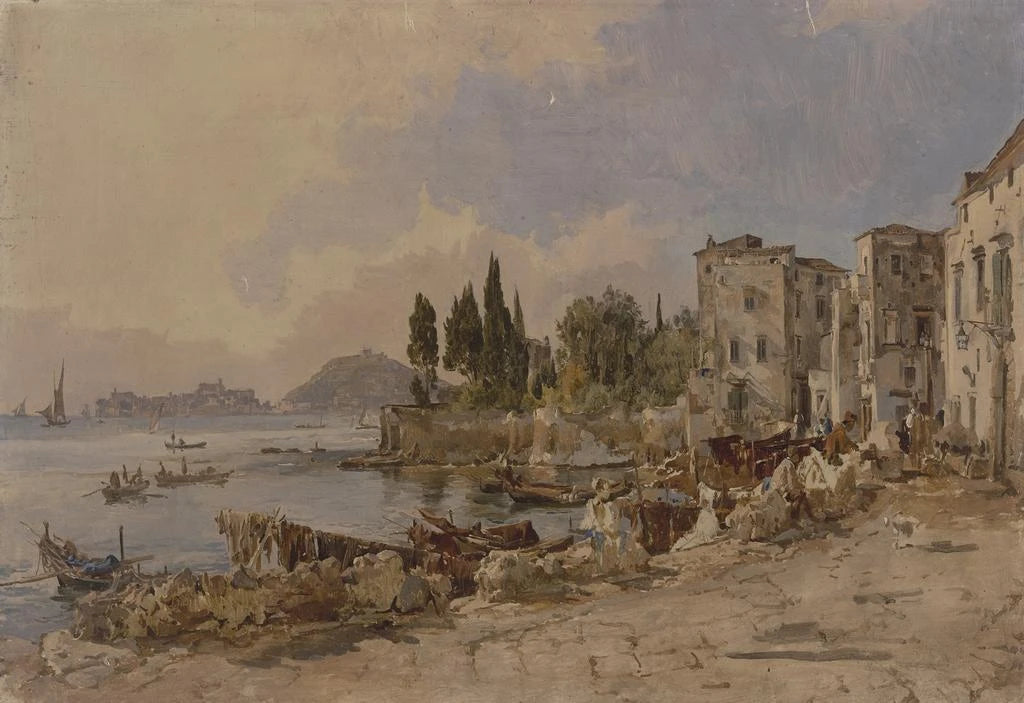 The art print of Quai de Gaeta immerses us in a lively scene, where port activity blends with the beauty of Italian landscapes. Johann Nepomuk Rauch, with his distinctive style, manages to capture the essence of maritime life, where boats dance on the waves and characters bustle on the quay. The warm hues of the sunset sky are reflected in the water, creating an atmosphere that is both dynamic and peaceful. Every detail, from the sails of the boats to the faces of the sailors, bears witness to a moment frozen in time, inviting the viewer to feel the energy of this iconic place.