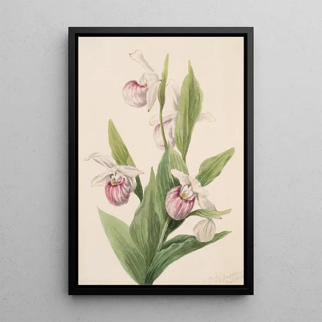 La reproduction du Sabot de la reine dévoile une composition florale d'une rare élégance. Les teintes vives de jaune et de violet s'entrelacent avec grâce, créant un contraste saisissant qui attire immédiatement le regard. La technique de l’aquarelle, maîtrisée par Mary Vaux Walcott, permet de rendre les textures délicates des pétales et des feuilles, tout en conservant une légèreté aérienne. Cette œuvre évoque la magie des jardins, où chaque fleur raconte une histoire, invitant le spectateur à s'émerveiller devant la beauté éphémère de la nature.