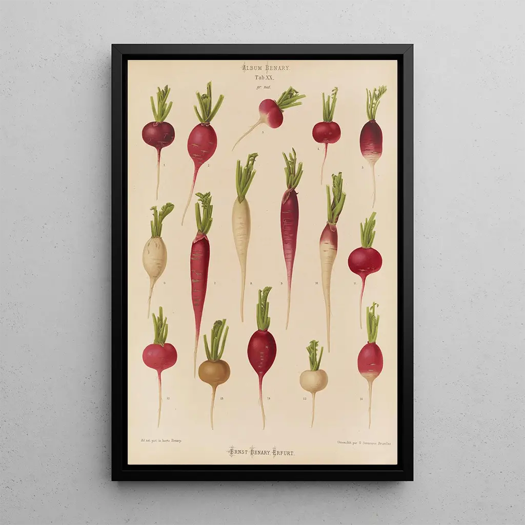 Radishes: a still life full of freshness "Radishes" by Ernst Benary is an art print that celebrates the beauty of earth's produce with striking simplicity. The canvas features a harmonious composition where radishes, with vivid and bright colors, are arranged to attract the eye. The shades of red, green, and white create a striking contrast, while the light plays on the smooth surfaces of the vegetables, giving them life. This still life evokes not only the freshness of harvests but also a certain joie de vivre, inviting the viewer to appreciate the simple pleasures of nature. Ernst Benary: the artist of culinary pleasures Ernst Benary, painter and illustrator of the early 20th century, is best known for his representations of still life, highlighting food products. His style, influenced by the realism movement, focuses on a faithful depiction of objects while imparting an almost poetic dimension. At a time when culinary art was gaining importance in culture, Benary captured the essence of food with precision and sensitivity, making him an essential artist in the field of still life. A decorative acquisition with multiple assets The art print "Radishes" is an ideal decorative choice for kitchens, dining rooms, or any space where one wishes to celebrate gastronomy. Its reproduction quality ensures exceptional fidelity to the colors and details of the original artwork, bringing a touch of freshness and vitality to your interior decor. This painting, with its joyful and colorful theme, invites conviviality and appreciation of life's simple pleasures, making each meal a little more special.