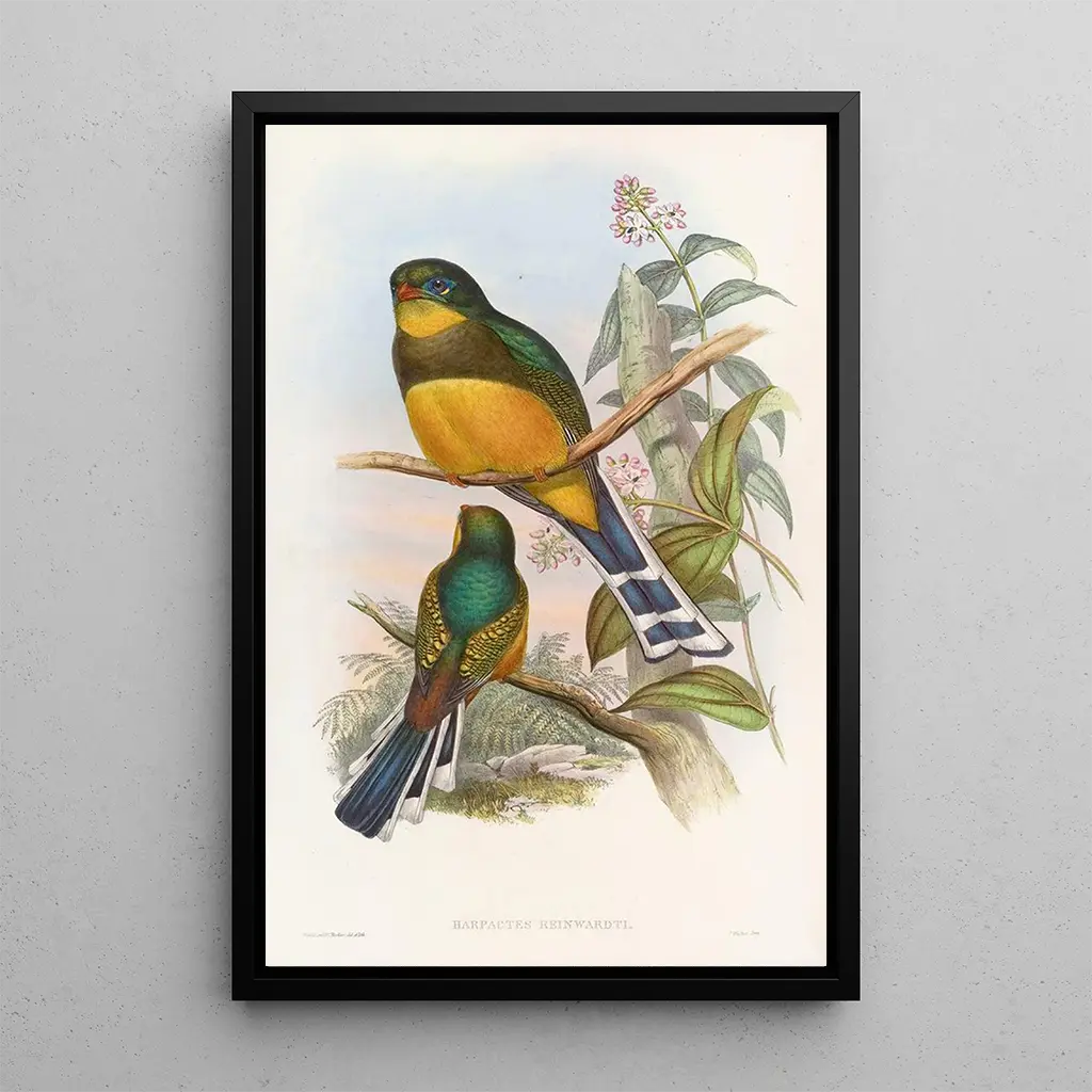 Trogon de Reinwardt : an ornithological art print to discover The Trogon de Reinwardt, with its dazzling plumage and vibrant hues, presents itself as a living work of art. John Gould, a British ornithologist and illustrator, masterfully captured the essence of this fascinating bird through meticulous technique. The shimmering colors of its feathers, ranging from emerald green to deep red, create an atmosphere that is both exotic and soothing. This art print invites contemplation of natural beauty, while revealing the delicacy of the details that have made Gould renowned. John Gould : pioneer of artistic ornithology John Gould, active in the 19th century, is often regarded as one of the greatest bird illustrators of his time. Influenced by the travels and scientific discoveries of his era, he dedicated his life to the study and depiction of birds from around the world. His works, including the Trogon de Reinwardt, demonstrate scientific precision combined with exceptional artistic sensibility. Gould published numerous works, contributing to ornithological knowledge while elevating illustration to an art form. His legacy endures, inspiring generations of artists and naturalists. A decorative acquisition with multiple assets The art print of the Trogon de Reinwardt is much more than a simple illustration; it is a decorative piece that will add a touch of exoticism to your interior. Whether in a living room, office, or bedroom, this poster catches the eye and sparks admiration. Its print quality and fidelity to the original colors guarantee an exceptional aesthetic rendering. By choosing this canvas, you opt for a piece that combines natural beauty with artistic craftsmanship, enriching your living space with a note of sophistication and charm.