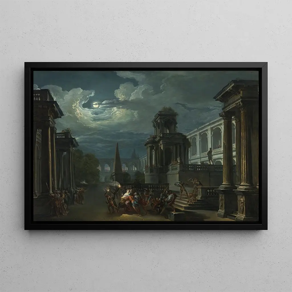 "Helene's Abduction" by Giovanni Paolo Panini is a work that captures the very essence of mythological drama. The scene, rich in movement and emotion, depicts the pivotal moment when Helene is abducted by Paris, an event that will trigger the Trojan War. The vivid colors and meticulous details of the characters and architecture create a dynamic and captivating atmosphere. Panini's technique, blending baroque and classicism, brings this mythological narrative to life, transporting the viewer into a world where the fate of heroes is at stake.
