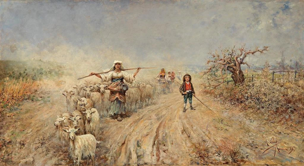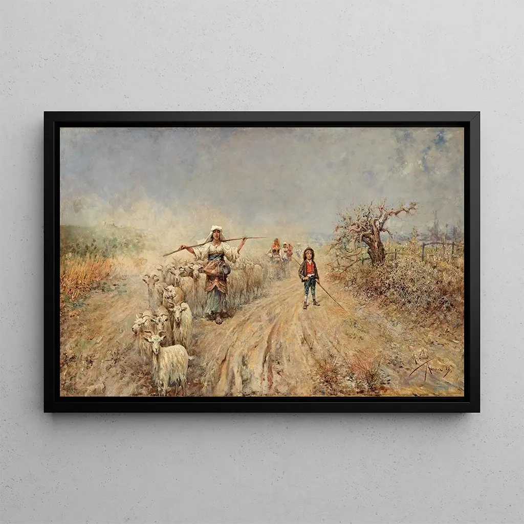 Return of the Herd: a bucolic scene imbued with serenity The art print Return of the Herd depicts a bucolic scene where nature and man coexist in harmony. The warm, earthy colors, mixed with touches of green, evoke the gentle atmosphere of a late afternoon in the countryside. The characters, portrayed with particular attention to detail, seem to be busy around the animals peacefully returning home. The painting technique, likely oil, gives the work depth and texture that captivate the eye. This everyday scene, filled with tranquility, invites reflection on the bond between man and his environment. Rafael Senet y Pérez: a master of Spanish realism Rafael Senet y Pérez, a 19th-century Spanish artist, is renowned for his works that capture rural life with remarkable precision and sensitivity. Influenced by the realist movement, he seeks to depict scenes of daily life, far from romantic ideals. Senet y Pérez has established himself in the Spanish artistic landscape through his ability to convey emotions through his characters and landscapes. His work, often focused on nature and the rural world, reflects an era when art turned toward more authentic and accessible subjects, paying homage to the simple beauty of life. A decorative acquisition with multiple assets The art print Return of the Herd is a decorative piece that fits perfectly into various environments, whether a living room, dining room, or office. Its quality reproduction and visual appeal make it an ideal choice for those wishing to add a touch of rustic charm to their interior. The canvas, faithful to the original work, allows you to enjoy the beauty of this scene without losing authenticity. By choosing this art print, you bring a warm and welcoming atmosphere to your space, while celebrating the artistic heritage of Rafael Senet y Pérez.